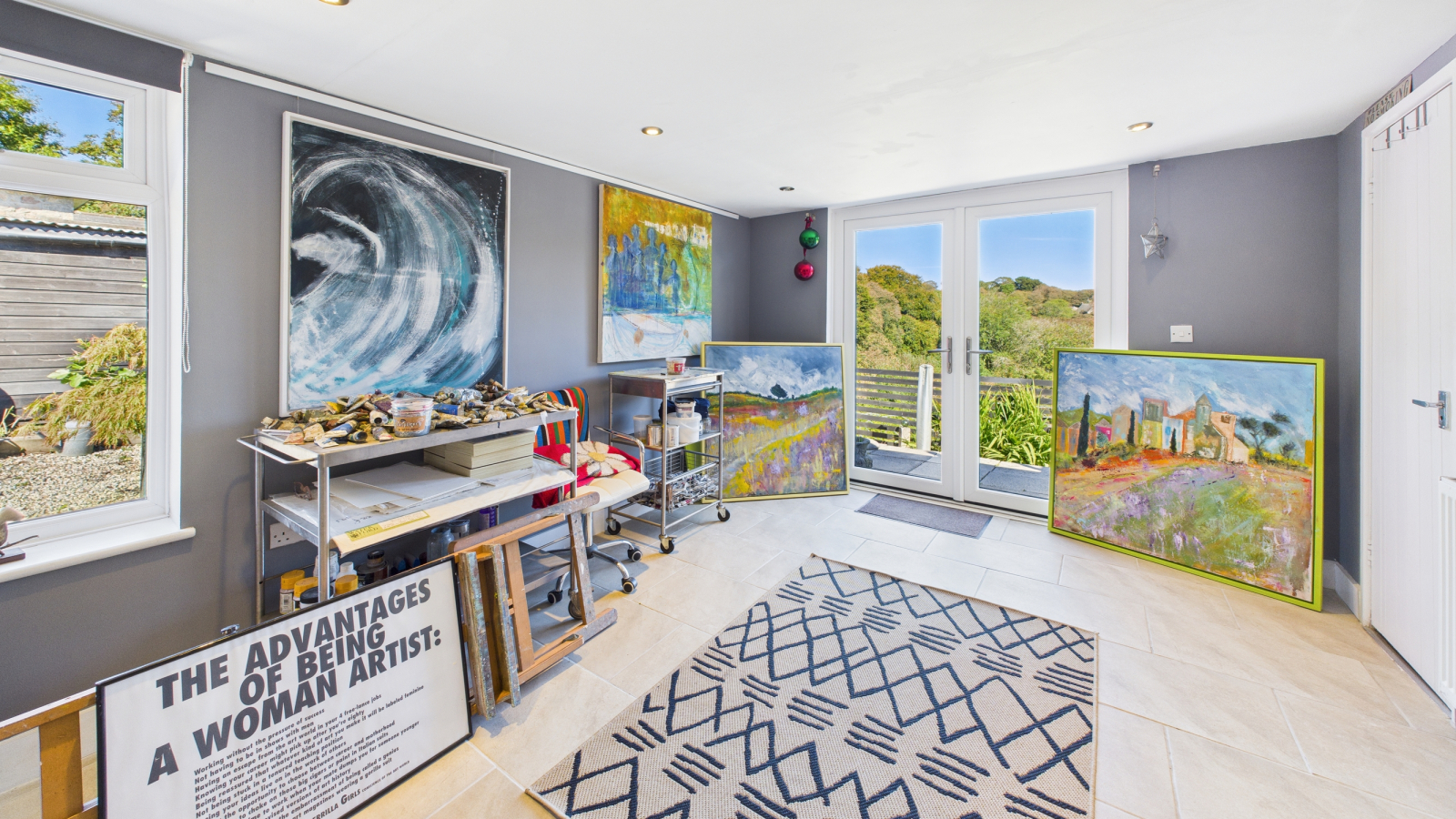 Double glazed window to side, double glazed patio doors onto rear sun terrace with views over Trevaylor Valley, tiled floor, inset spotlights, radiator, door to: