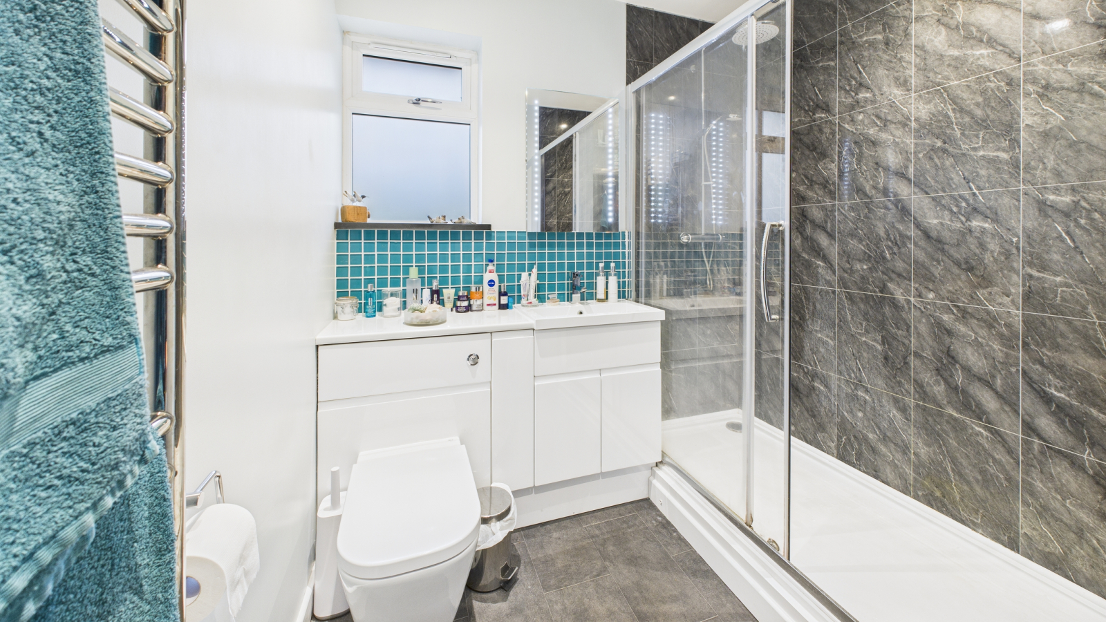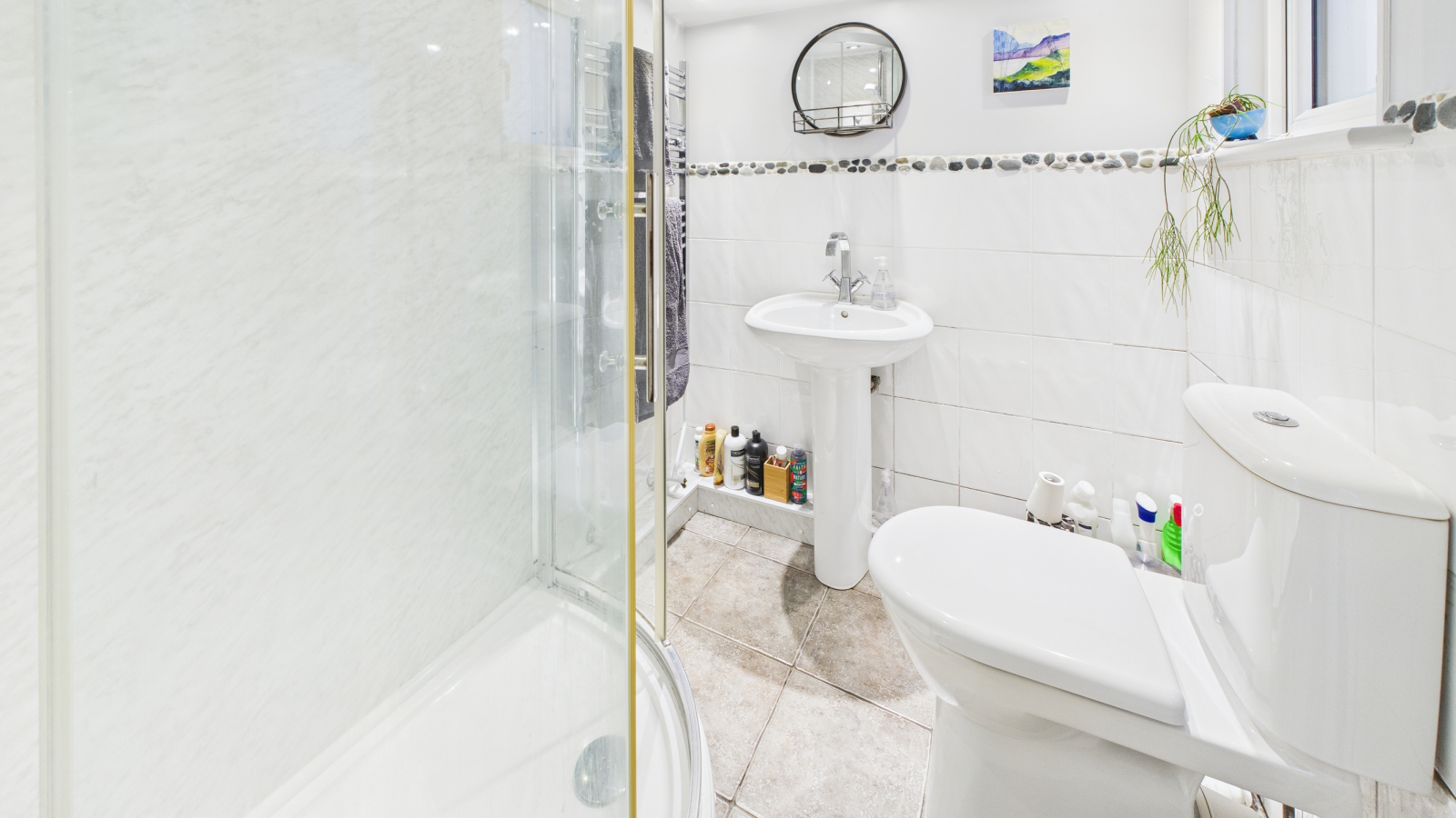 Electric shower, WC, pedestal wash hand basin, double glazed door and window to rear, fully tiled walls and floor, heated towel rail, inset spotlights.