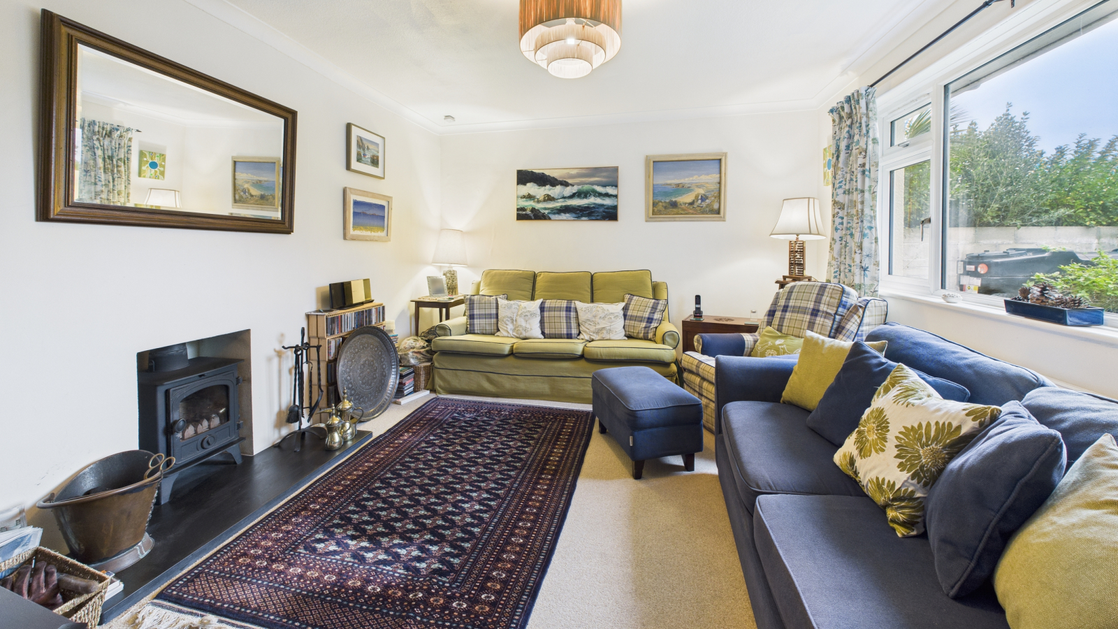 Double glazed window to front, coved ceiling, radiator, TV point, multi fuel burner on slate hearth.