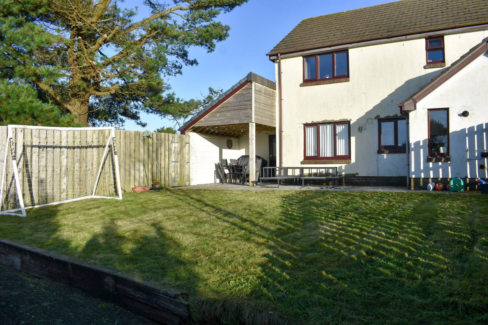Externally there is a lawned garden to the front and tandem parking leading to the garage. There is also an additional parking space to the front. The rear garden is enclosed and laid to lawn with a lovely patio and a covered area off the back of the garage which is suitable for sitting, relaxing and entertaining.