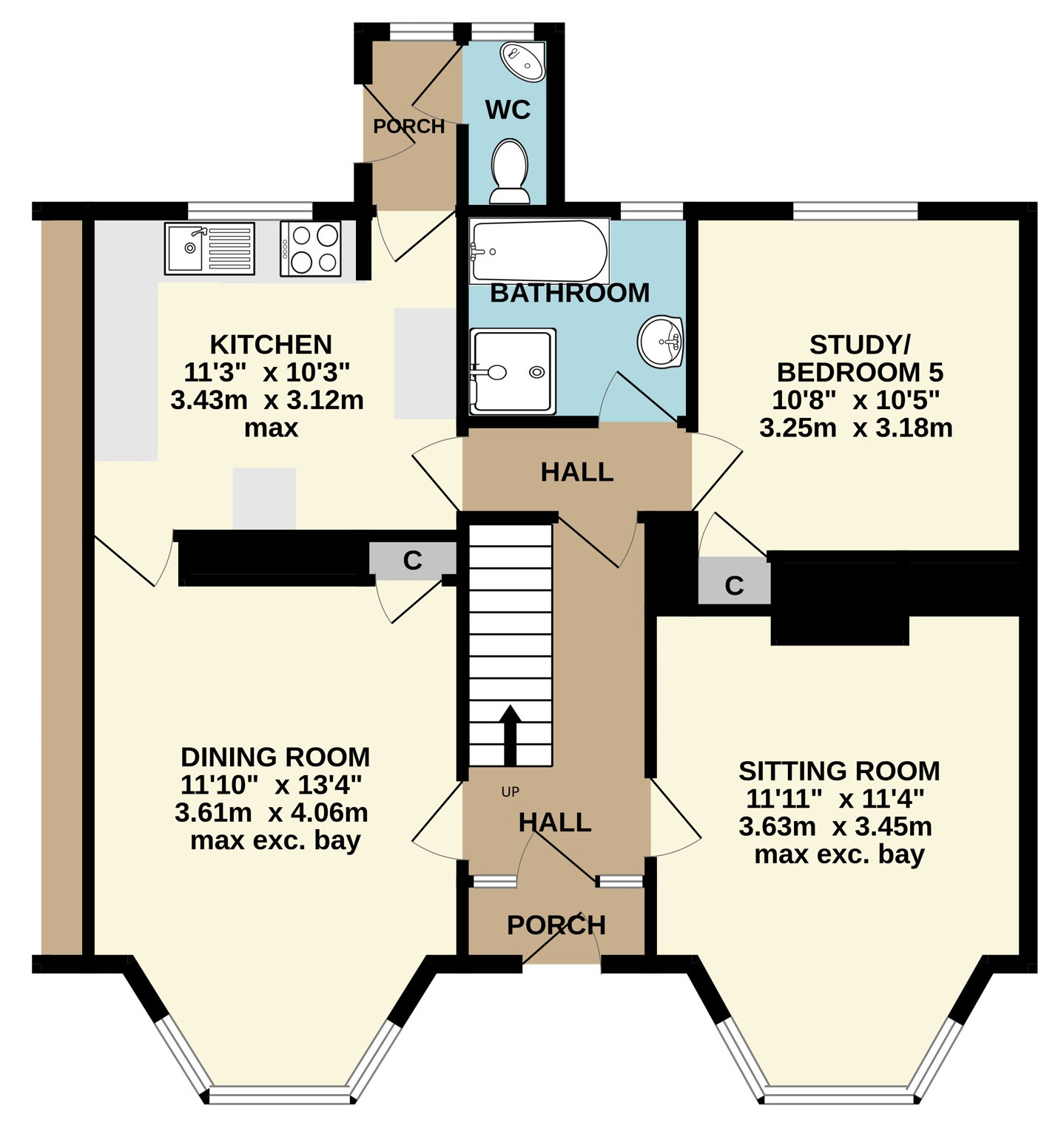 - Both the dining room and sitting room enjoy a bay window providing a view over the established garden and the wider countryside.