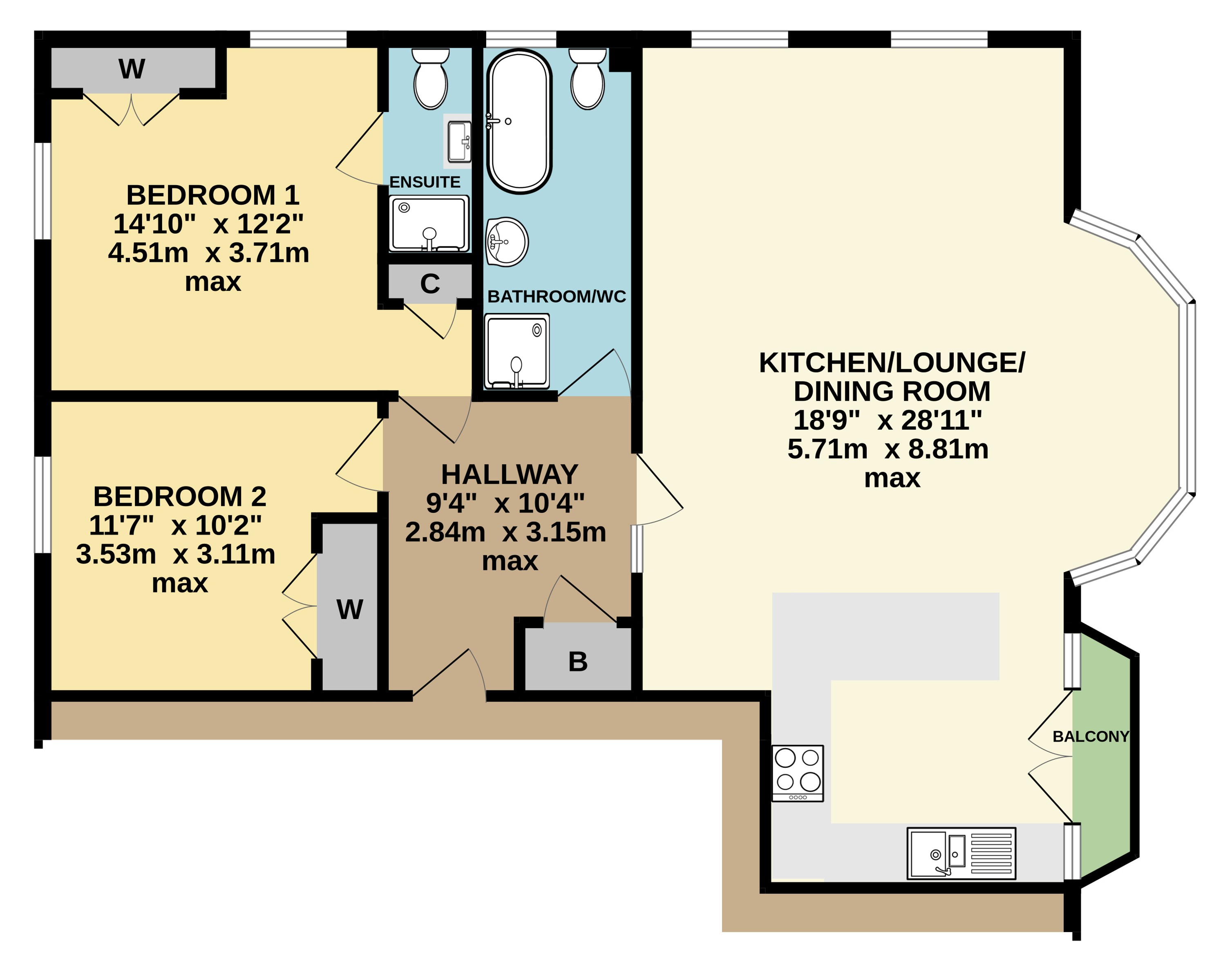 - Light and airy open plan living space enjoying access to a balcony and fine views over the communal gardens and Coronation Park.