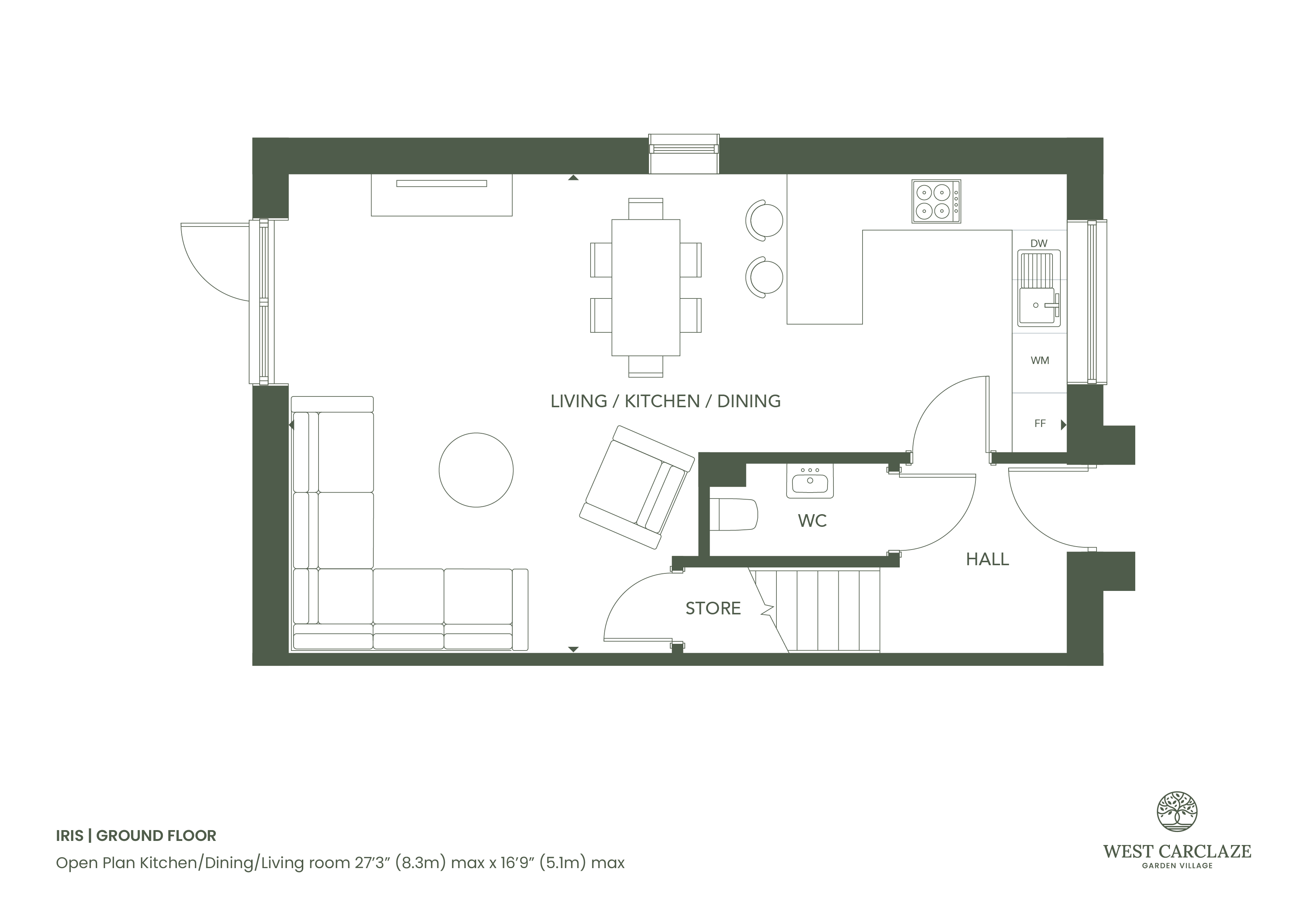 Open Plan Kitchen/Living/Dining 27'3" max x 16'9" max (8.3m max x 5.1m max).