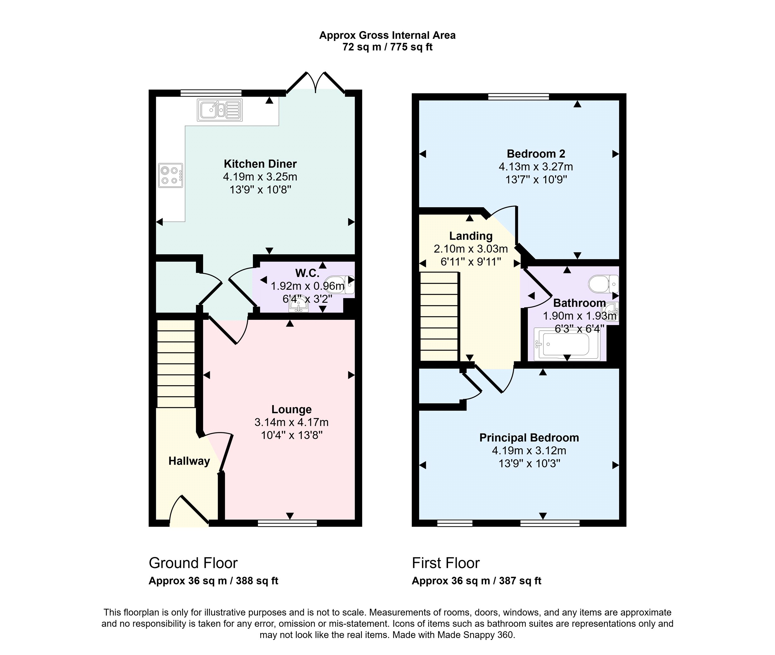 Upstairs are two double bedrooms, both with good natural light, and a family bathroom with a white suite and part-tiled walls. The home benefits from mains gas central heating and double glazing throughout.