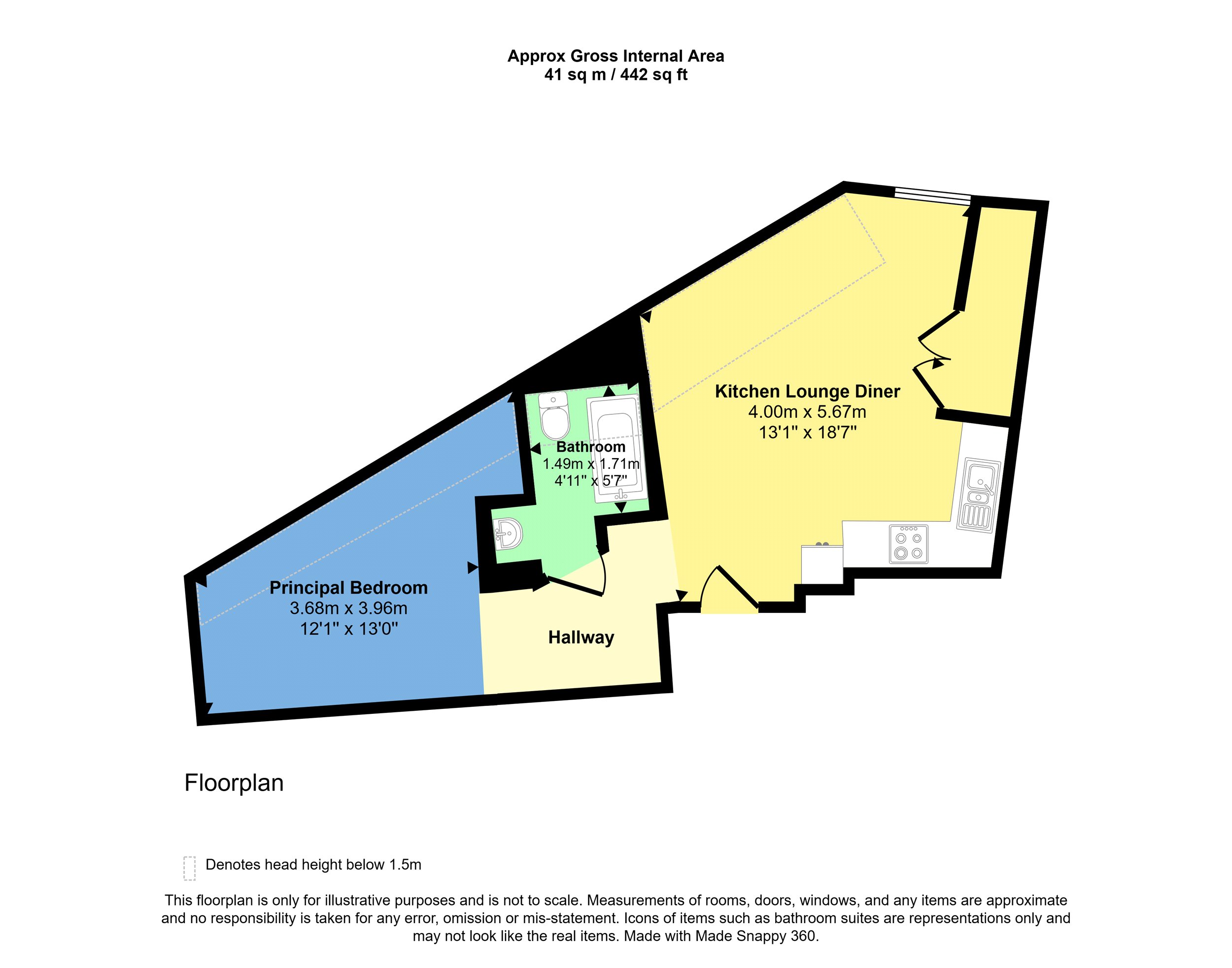 The front door opens into a hallway leading into a generous open-plan living space which accommodates a well-equipped kitchen, lounge, and dining area. The kitchen features a contemporary design with integrated electric hob and oven, under-counter appliance space, and ample storage. Natural light enters through a dormer-style window, while sloped ceilings give character to the living space.