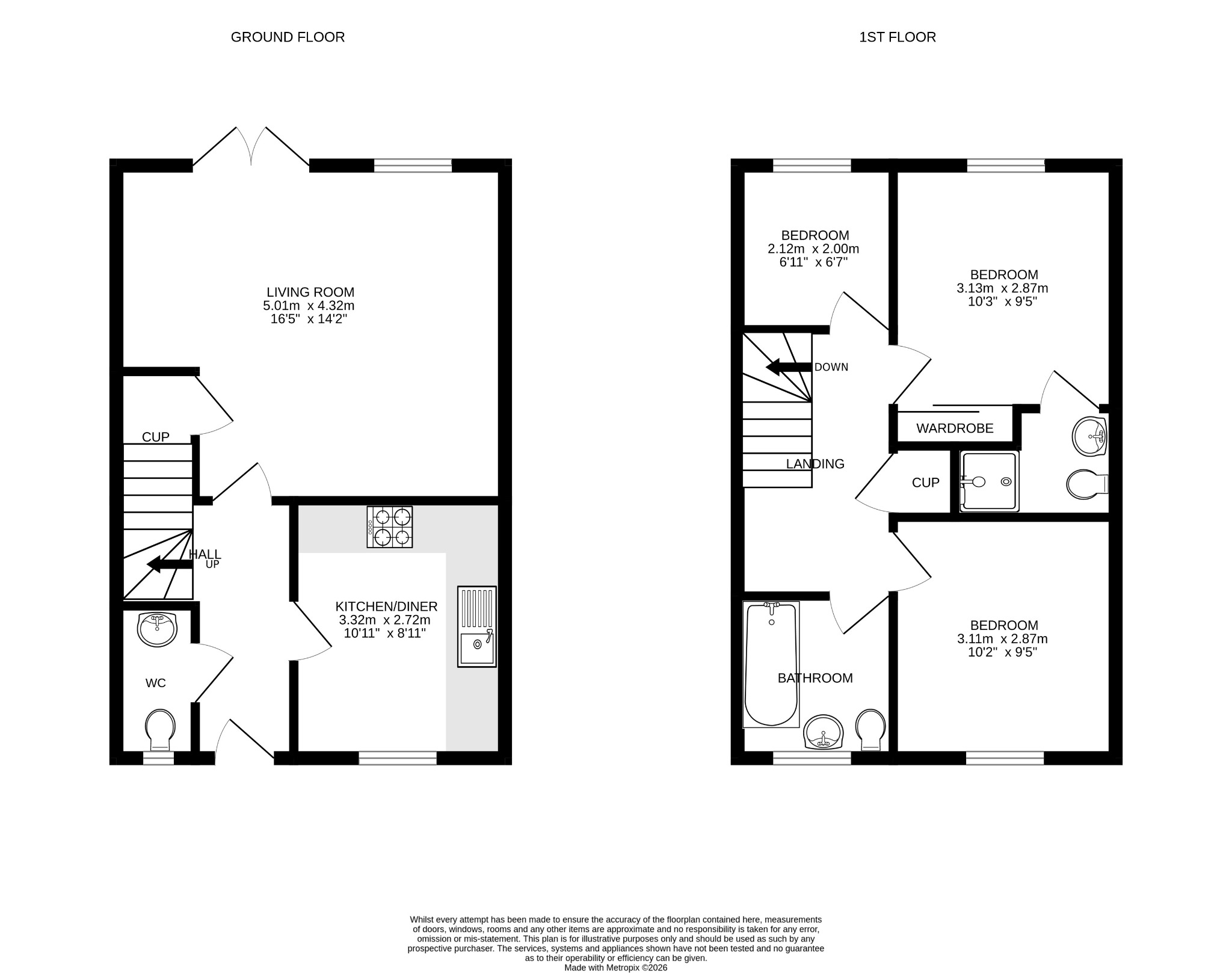 Accommodation – Entrance Hall, WC, Kitchen, Lounge/Diner. Upstairs to Bedroom 1 with ensuite shower room and Built in wardrobe. Bedroom 2, Bedroom 3, Family Bathroom and Storage cupboard.