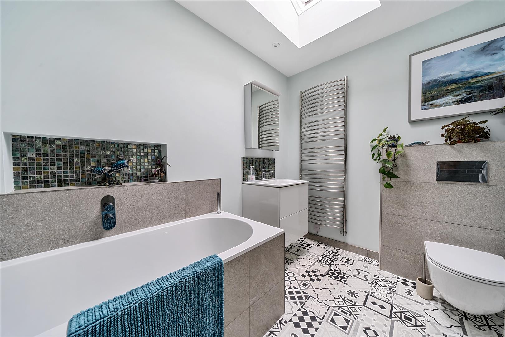 Further down the central hallway are the three bedrooms with the master benefiting from built-in wardrobes and an ensuite. A rather stylish family bathroom provides the perfect place to unwind, with a skylight above the deep-set bathtub inviting you to stargaze whilst relaxing at the end of a long day.