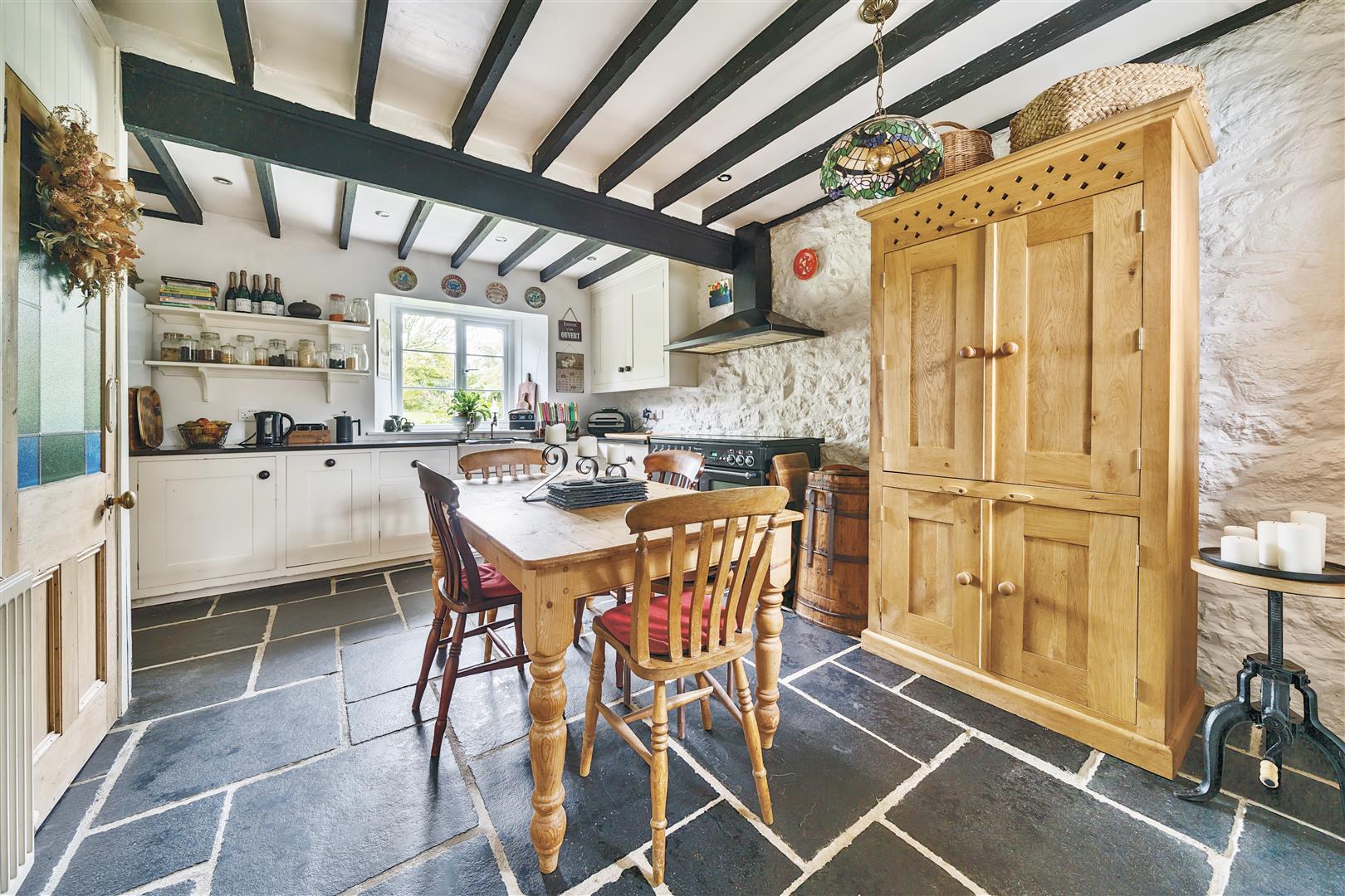 Particular features of this cottage include the hand-built farmhouse style kitchen/dining room with solid wood units sitting underneath granite worktops. Showcasing a slate floor and exposed beams, this sociable room also boasts a fabulous walk-in larder spoiling you for storage.