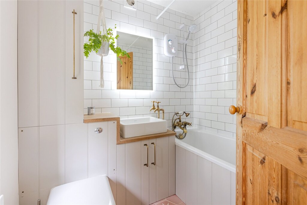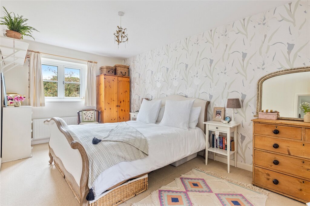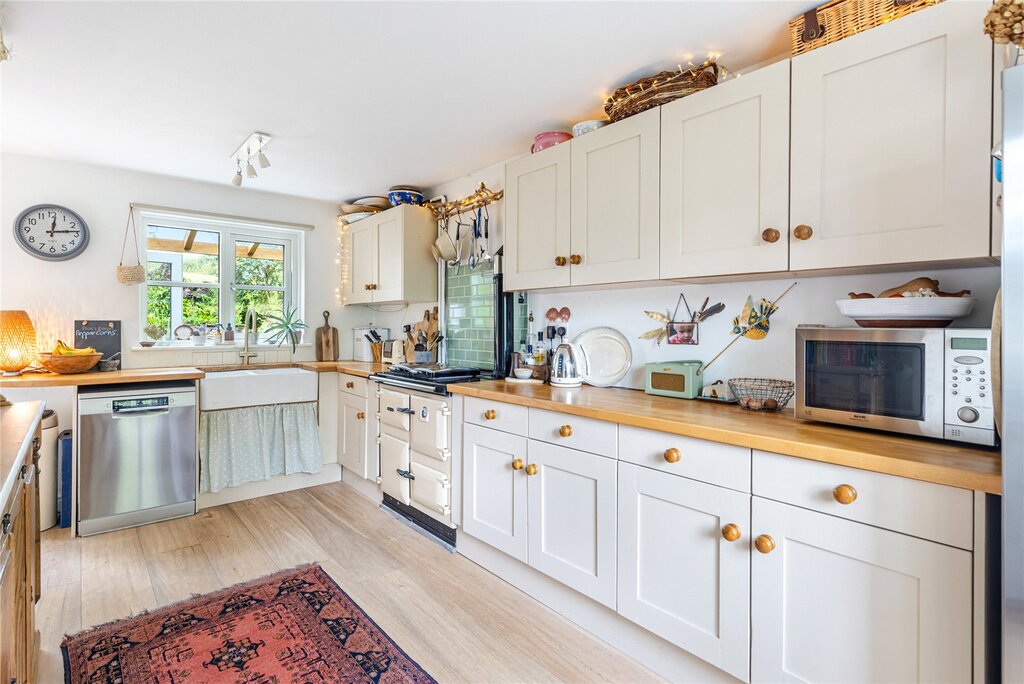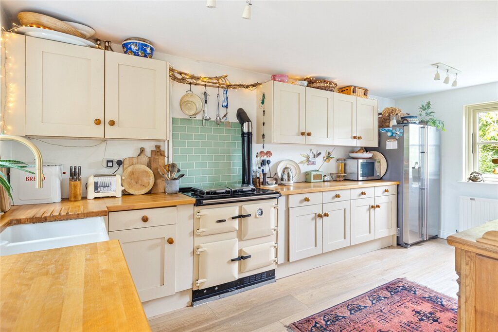 The ground floor has been historically extended to provide additional reception space, which provides a stunning light and airy dining room with bi-fold doors out to the garden. The sitting room offers a lovely, cosy space having a fireplace with log burner and oak lintel above. The country style kitchen is fitted with an oil-fired Rayburn and has plenty of space for other appliances. A cloakroom completes the ground floor.