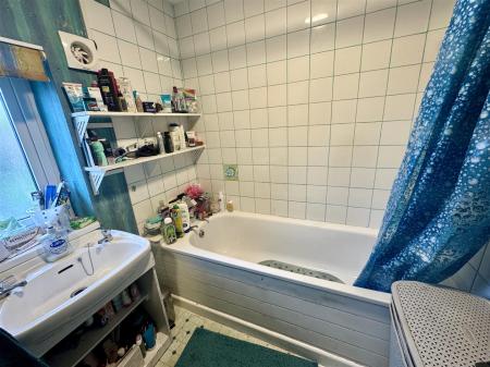 Bathroom - White suite comprising bath, electric shower over, tiled surround, wash hand basin, double radiator, front aspect frosted window.
