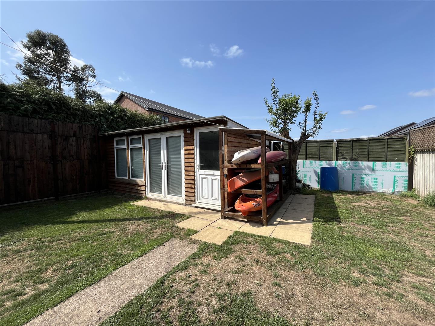 Outside - To the front of the property, there is access through to a large gravel parking and turning area, suitable for the parking of several vehicles, caravan etc., pathway to the front door, lawned area and raised borders, gated side access leads to a good sized COVERED STORAGE AREA and WOODEN SHED (25' x 5'11) with lighting. To the rear of the property, there is a large OPEN FRONTED COVERED SEATING AREA (20'7 x 13'1) which leads to a large lawned area, further substantial SUMMER HOUSE / GYM (17'8 x 12'4) with power and lighting, fully insulated with glazed French doors through to the outside. The west facing garden measures 65' x 33' and is private and enclosed.