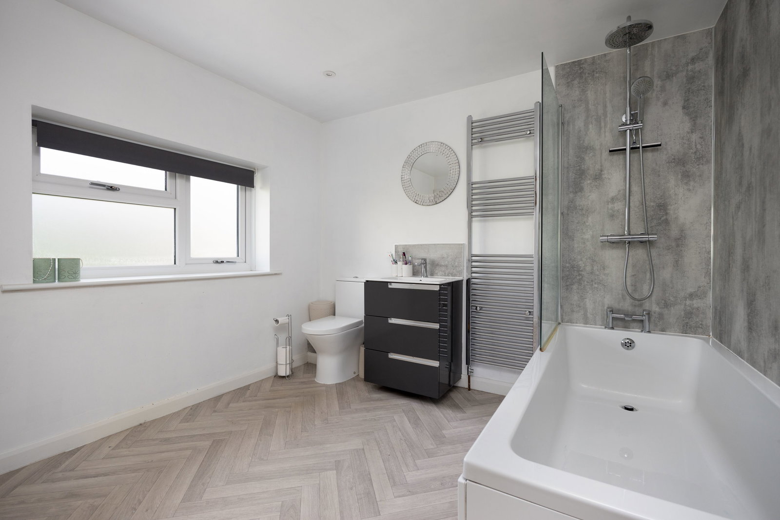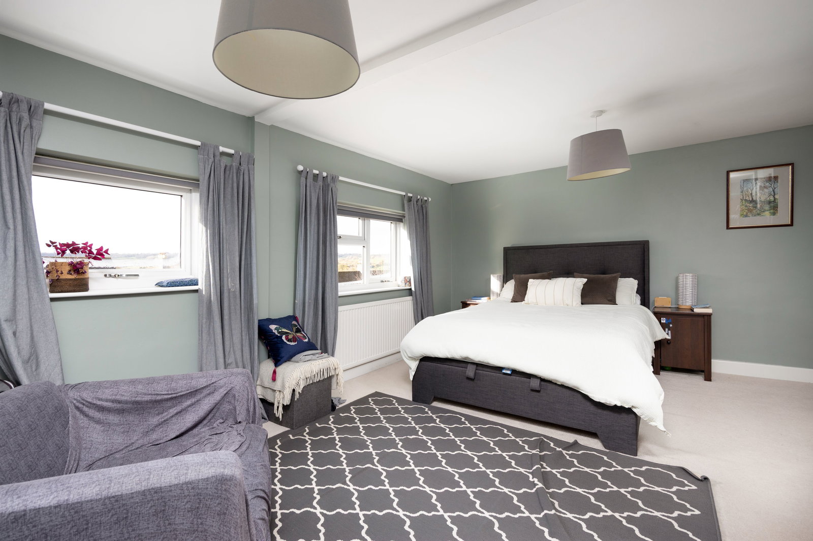 Stairs to the first floor give access to three double bedrooms and the family bathroom. The master bedroom has the wow factor and measures 16'1" x 12'. There is ample space to accommodate a super-king bed, double-aspect views over Box and towards Colerne, as well as an ensuite bathroom and walk-in wardrobe. The ensuite comprises a modern suite with bath and overhead shower. To complete the first floor, the family bathroom also has a modern white suite with shower cubicle, while the landing has been utilised as a study area with space for a desk.