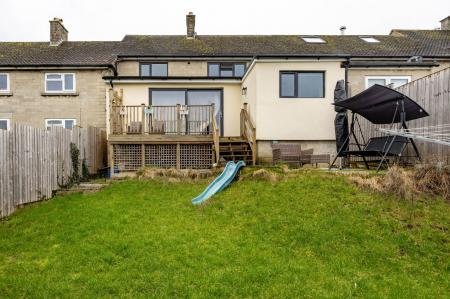 The South-west facing rear garden enjoys abundant sunlight and is predominantly laid to lawn, offering a perfect space for children’s play or family activities. A substantial raised decking area provides an excellent setting for outdoor dining, entertaining, or simply relaxing, with the added benefit of useful storage beneath. To the front, a gravelled driveway provides parking for two vehicles, with additional on-street parking available for visitors.