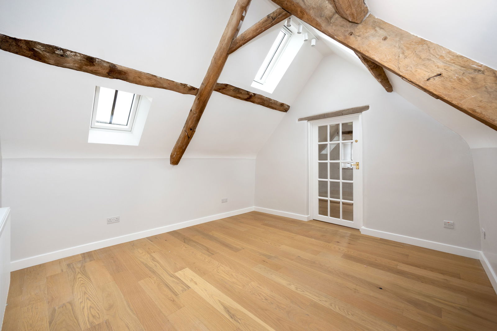 Upstairs, the master suite is a true highlight. With vaulted ceilings, exposed oak trusses, it boasts a walk-in dressing room and a luxurious bathroom with separate shower. A second double bedroom and stylish family bathroom are also on this floor. A separate staircase leads to the converted attic room — an expansive third bedroom, home office, or studio space with Velux windows and oak beams.