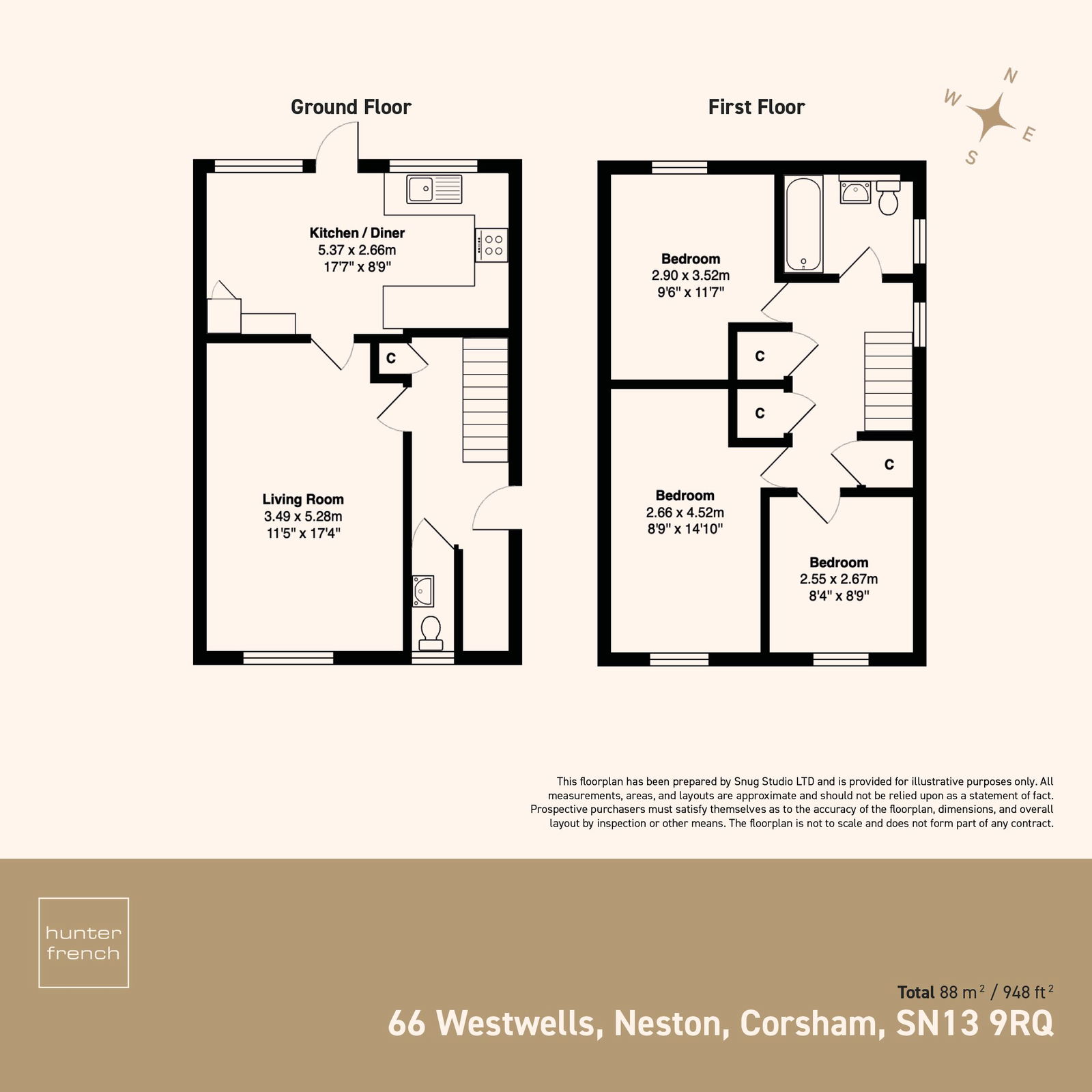 As you enter the property a hallway gives access to the ground floor accommodation, WC, and staircase to the first floor. Overlooking the front aspect and measuring 11’ 5” x 17’ 4”is the sitting room. The sitting room enjoys a light and airy feel courtesy of its south-easterly aspect and provides plenty of space for all the family to enjoy. Moving to rear of the property, the kitchen-diner overlooks the garden and has been modernised to become the heart of the home. Comprising fully fitted Shaker-Style wall and base units with wooden worktops, the kitchen provides ample storage and workspace as well as space for a freestanding dining table. There is a built-in electric oven and hob with further space for freestanding appliances.