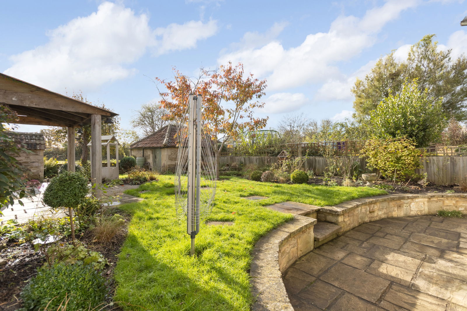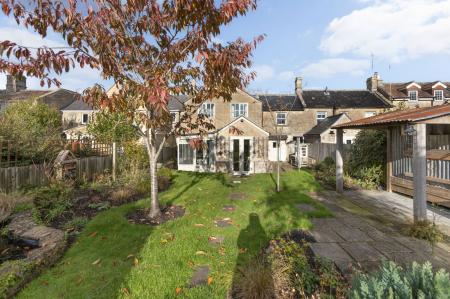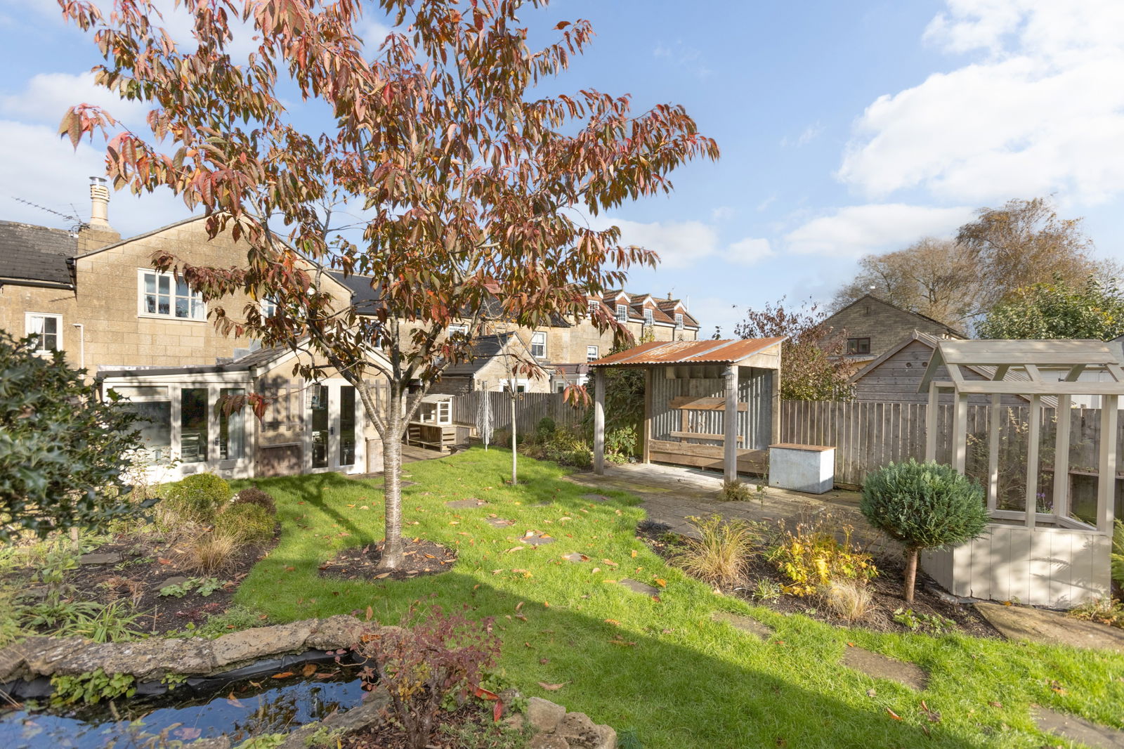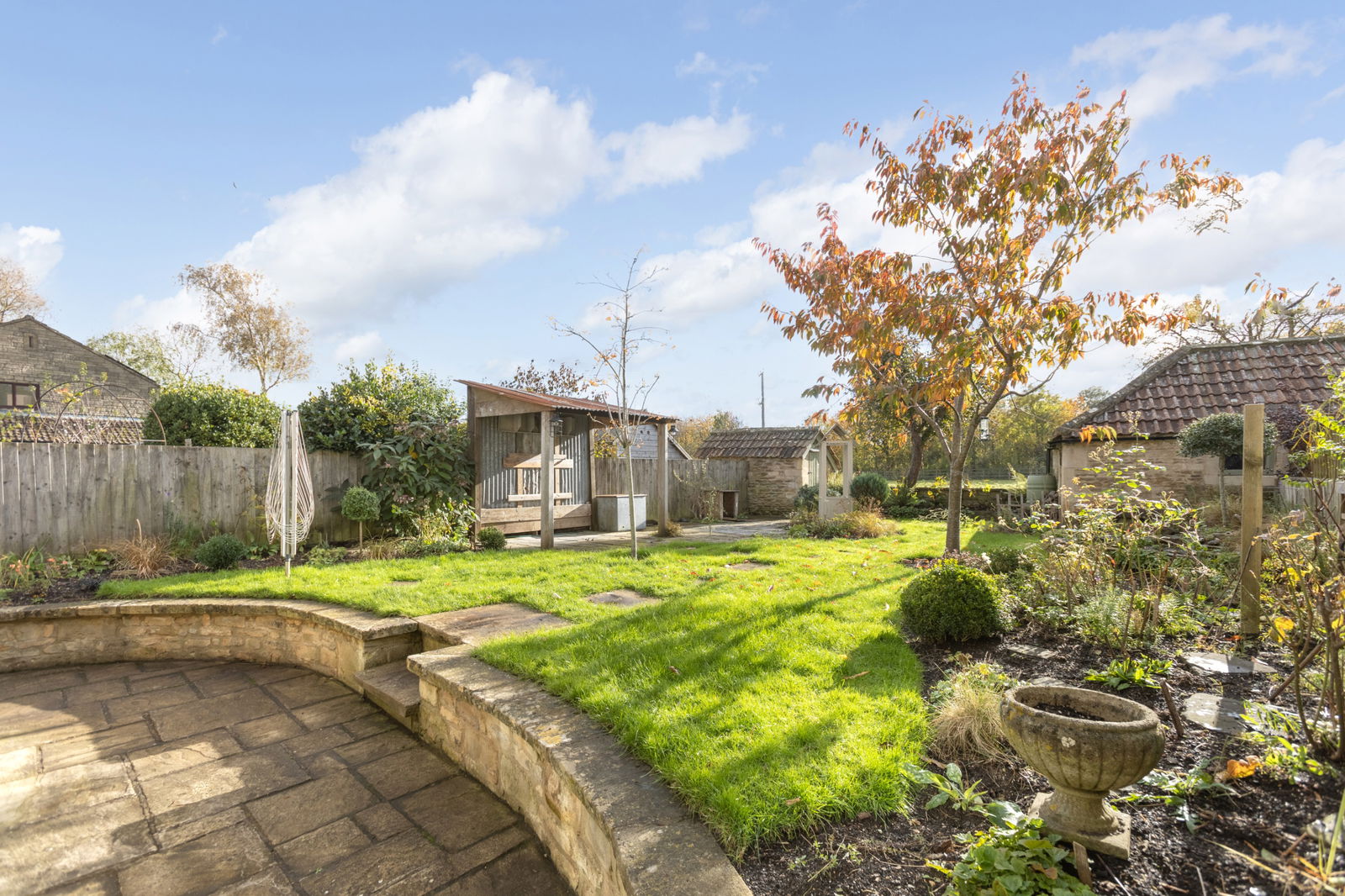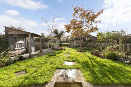- Level south-facing rear garden with a couple of outbuildings