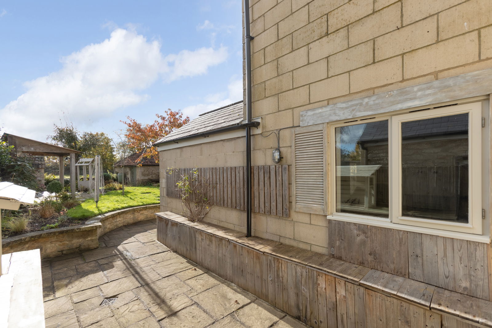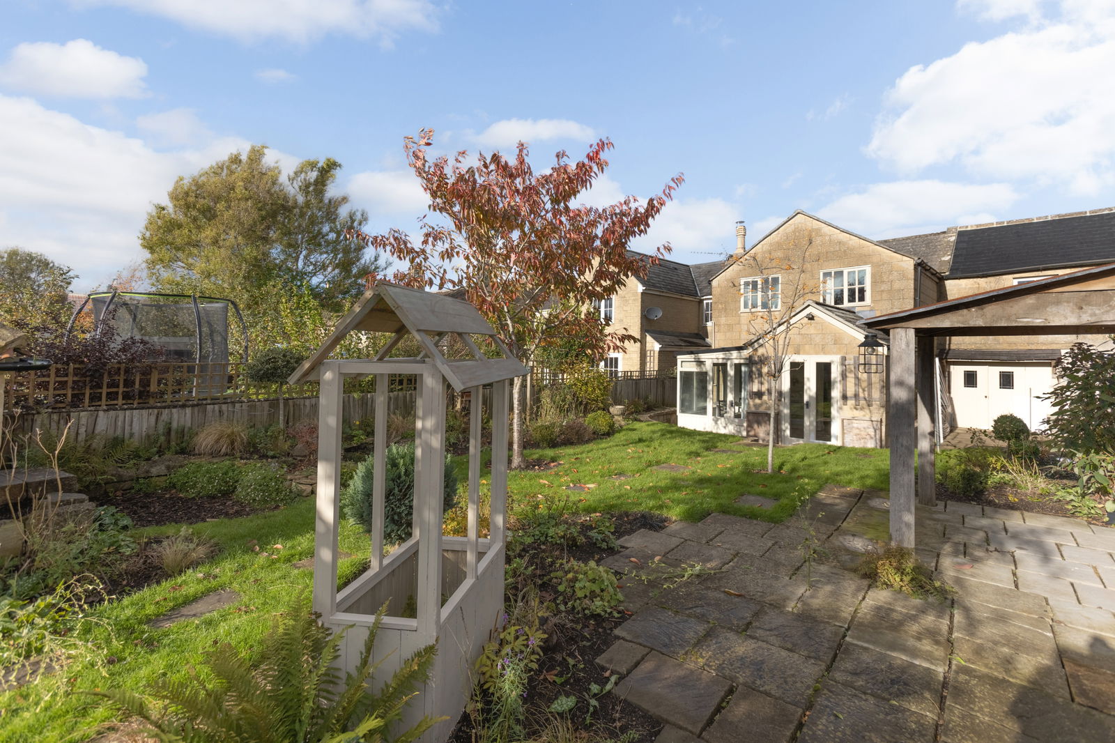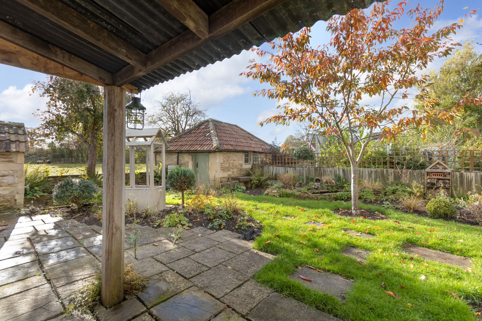 - Level south-facing rear garden with a couple of outbuildings