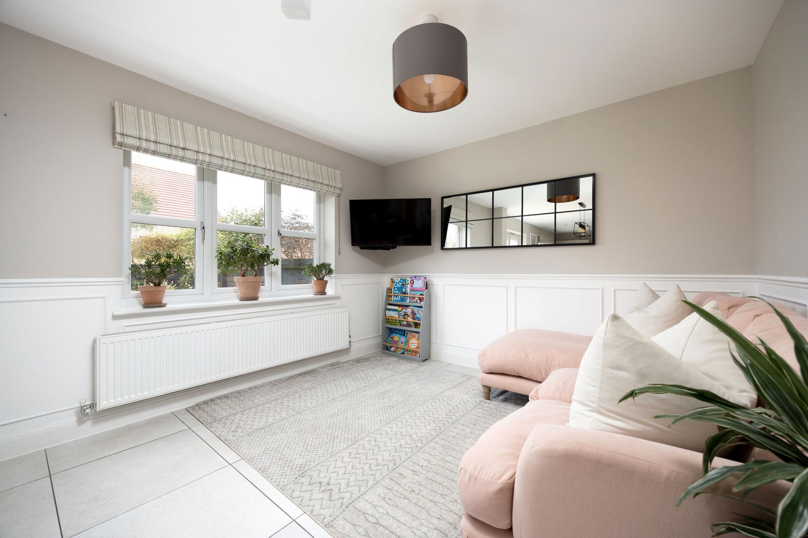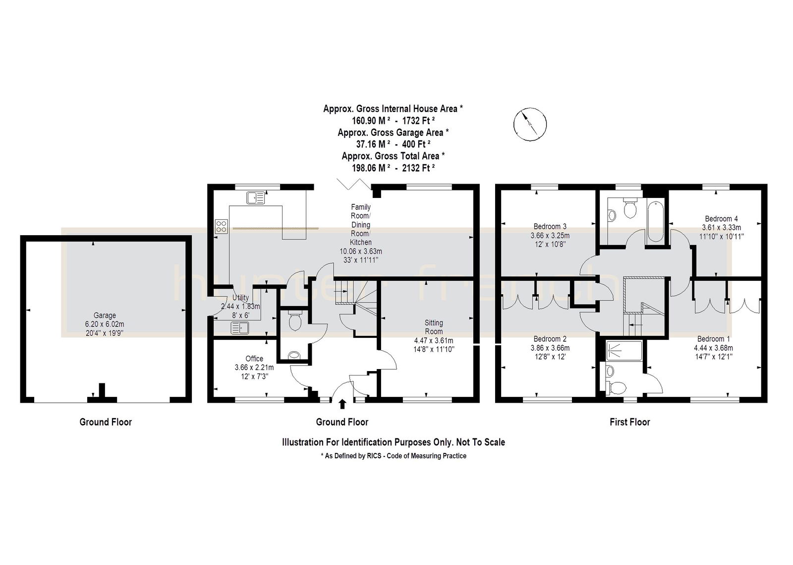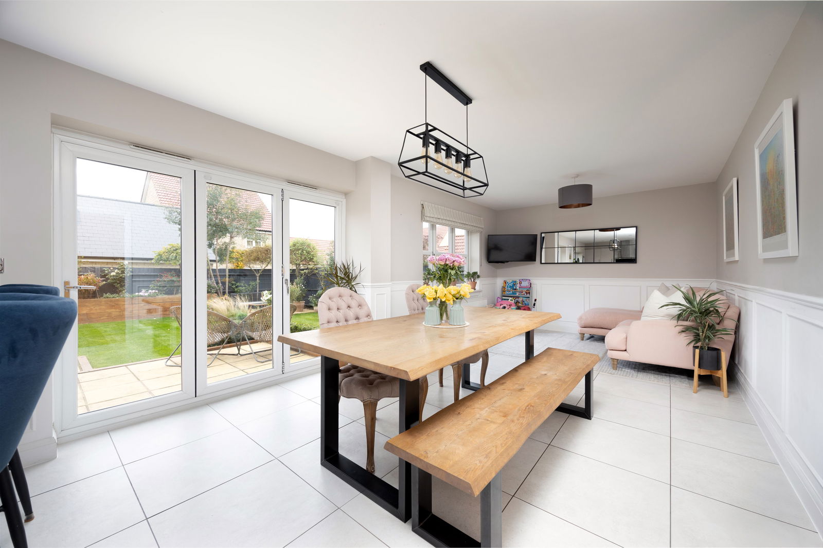 To the rear of the property and overlooking the garden is the kitchen-diner / family room. Measuring an impressive 33’ x 11’ 11”, this open plan living truly is the heart of the home and is a generous space for all the family to enjoy. The kitchen comprises of fully fitted wall and base units with Quartz worktops, fully integrated appliances as well as plenty of work top space and a breakfast bar. On top of this, there is a separate utility room with space for freestanding appliances. The kitchen-diner provides ample space for formal dining table and also a seating area from which you can enjoy views over the garden.