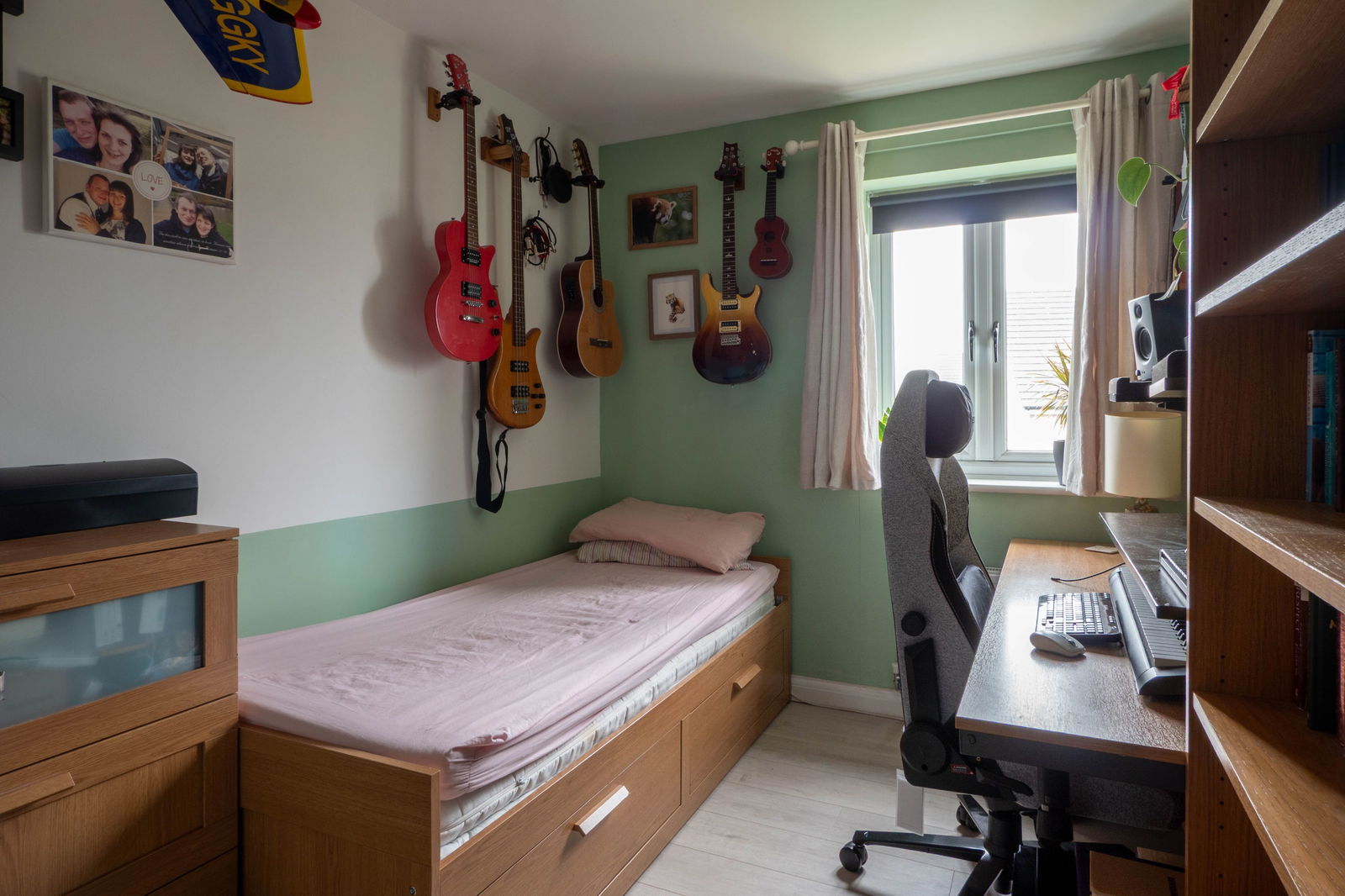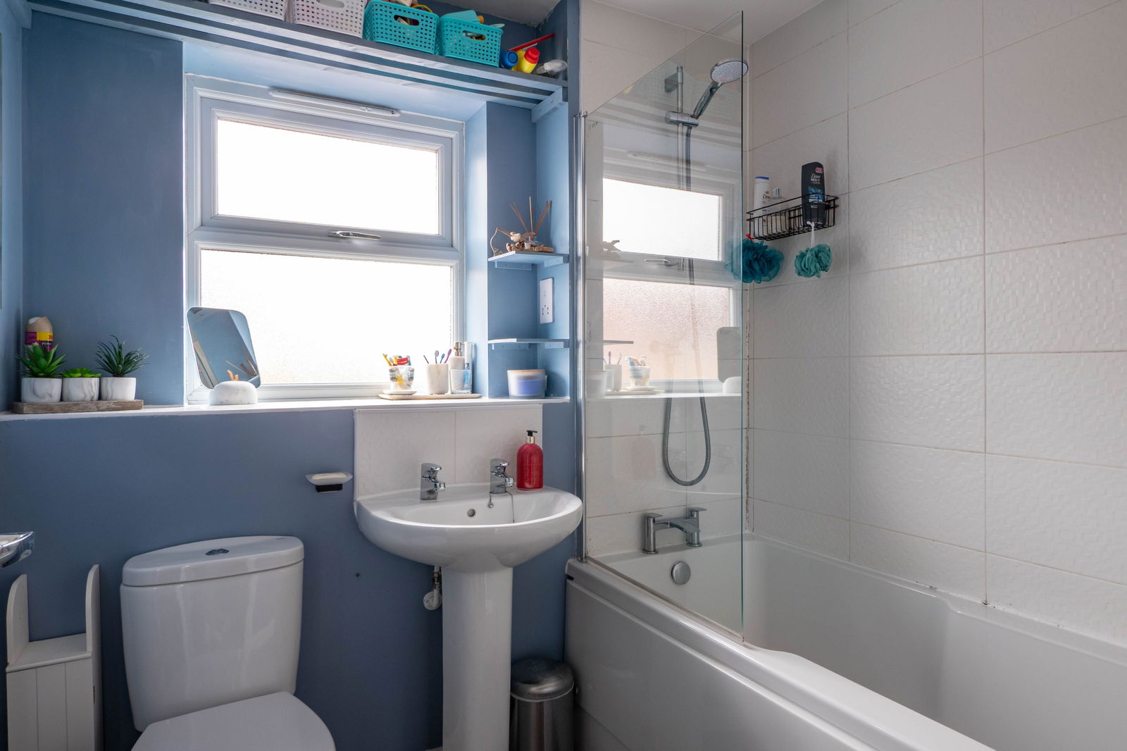 Stairs to the first-floor lead to all three bedrooms and the family bathroom. The master bedroom is positioned at the rear of the property overlooking the garden. Measuring 8” 8’ x 16” 6’, the master bedroom has space for a king-size bed and fitted wardrobes provide ample storage. Bedroom two is located at the front and is large enough to accommodate a large double bed and would make an excellent spare bedroom. Bedroom three, a large single bedroom, is currently used as a home office. To complete the first floor, the family bathroom comprises of a modern white suite with recently fitted bath with overhead shower.