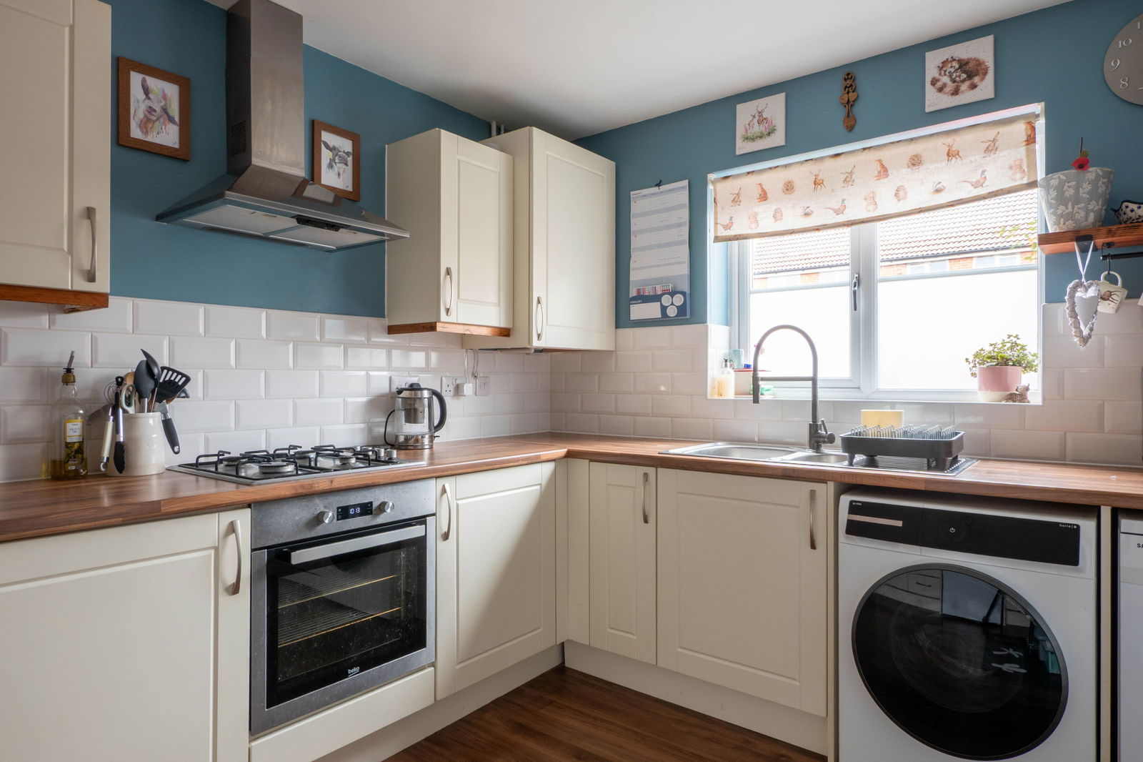 As you enter the property, a spacious hallway gives access to the ground floor accommodation, staircase to the first floor and downstairs WC. To the front aspect is the kitchen which benefits from fully fitted wall and base units, built-in gas hob and electric oven, and space for further freestanding appliances. Overlooking the rear aspect is the sitting/ dining room which gives access to the rear garden. Measuring 16’ 7” x 13” 3’, this reception space gives plenty of room to comfortably fit a freestanding dining table as well as a seating area with access via French doors to the garden.