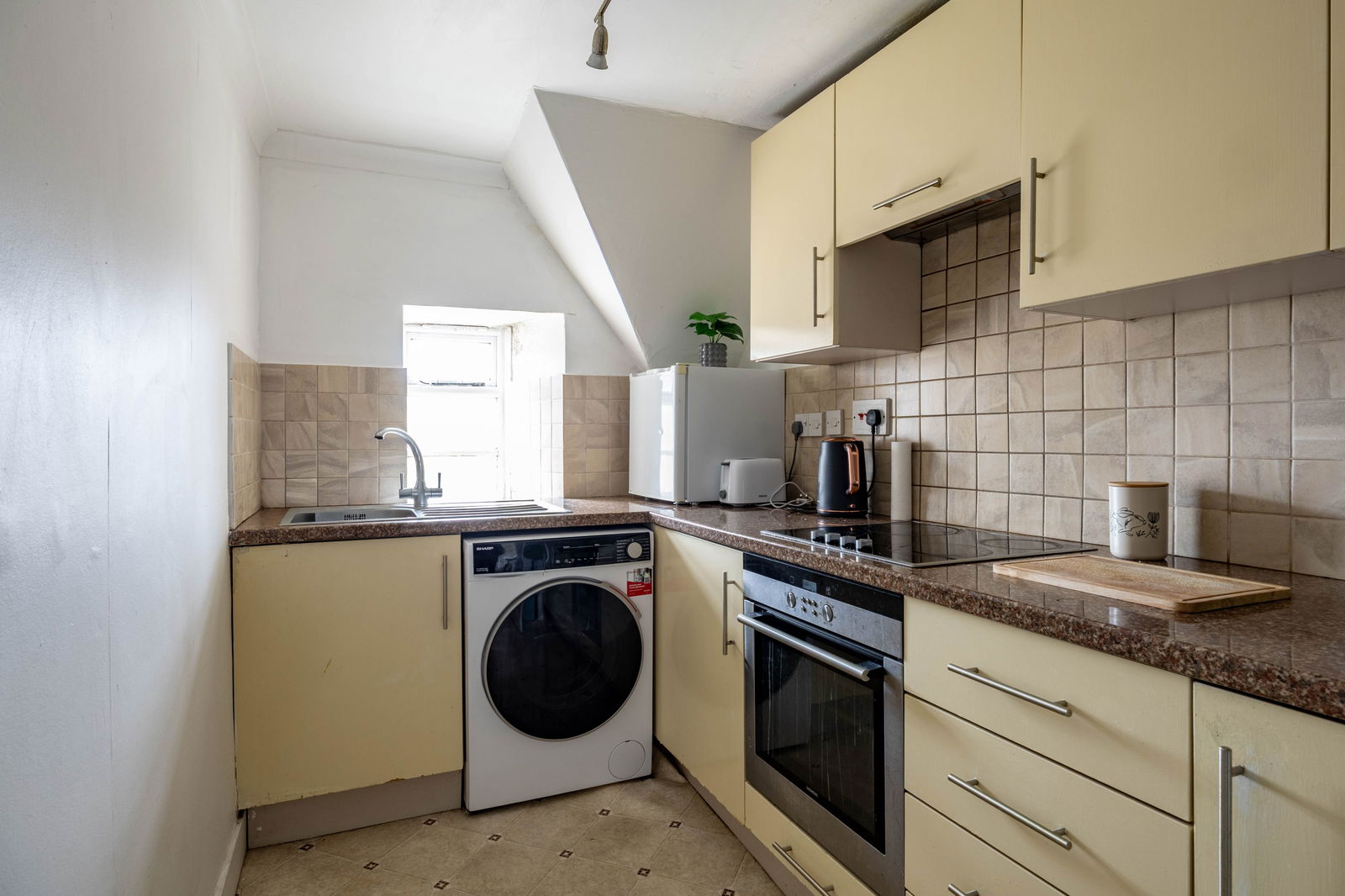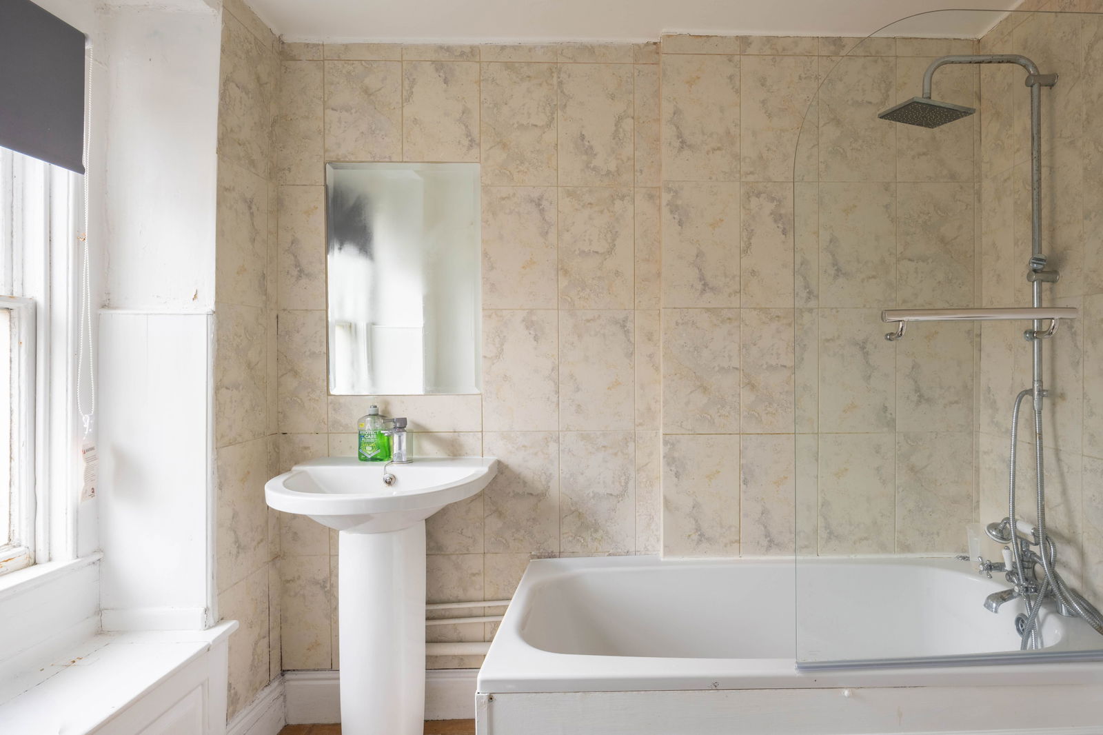 The master bedroom offers generous space for a double bed and features built-in storage housing the boiler. The bathroom comprises a marble-effect tiled suite, complete with a wash basin, toilet, and a shower over the bath.
