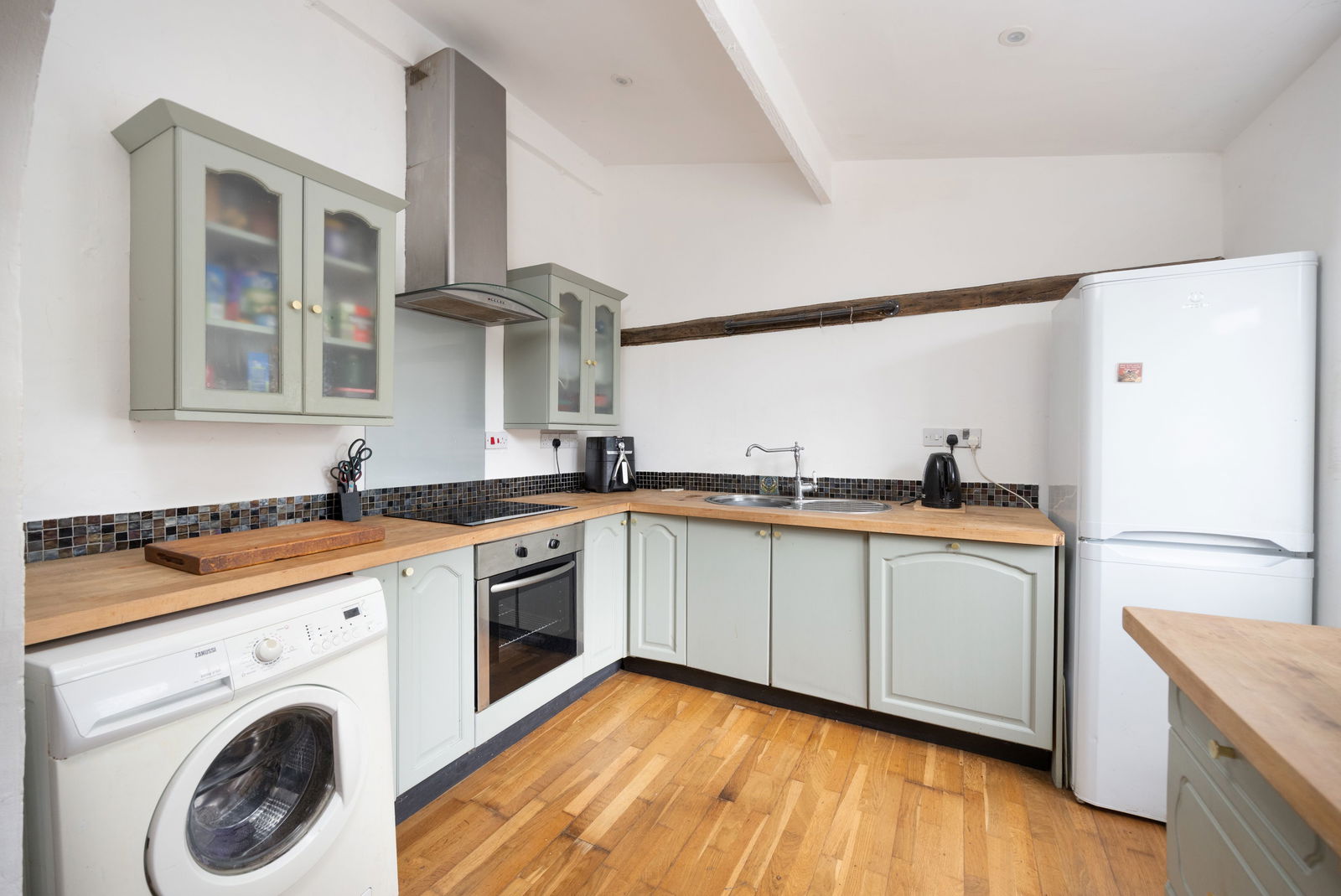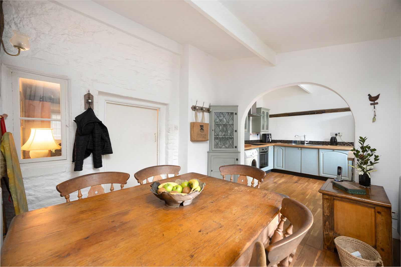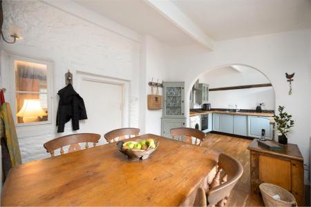 Moving from the sitting room to the rear of the cottage is a bright and sociable kitchen / dining room that enjoys further exposed wooden beams as well as tall ceilings that elevate the feeling of space. The kitchen comprises built-in wall and base units as well as a mixture of built-in and freestanding appliances with ample space for a freestanding dining table, and access to the private garden via patio doors.