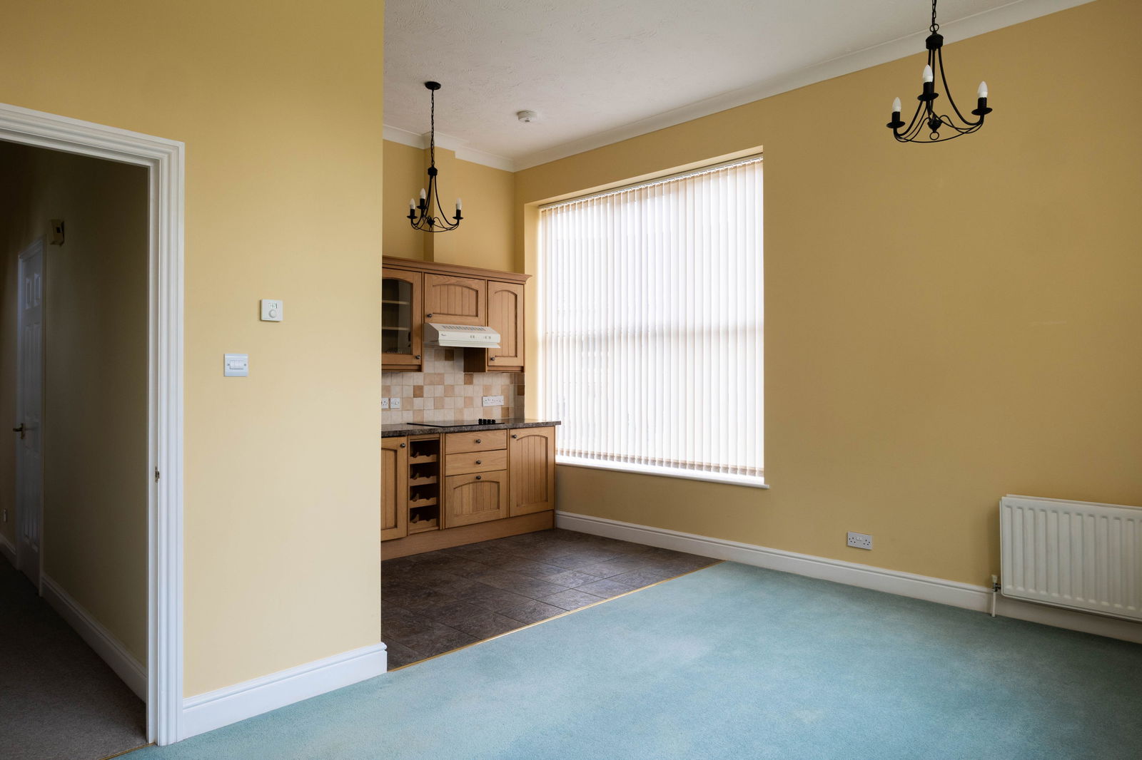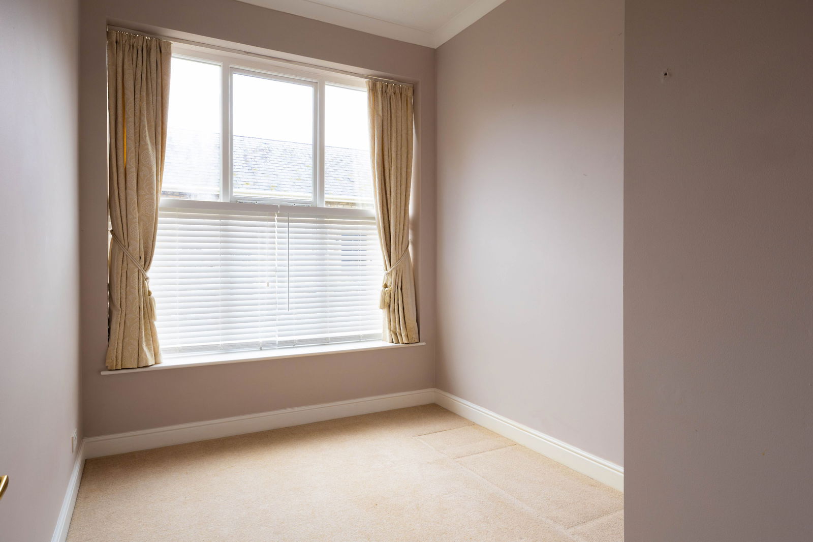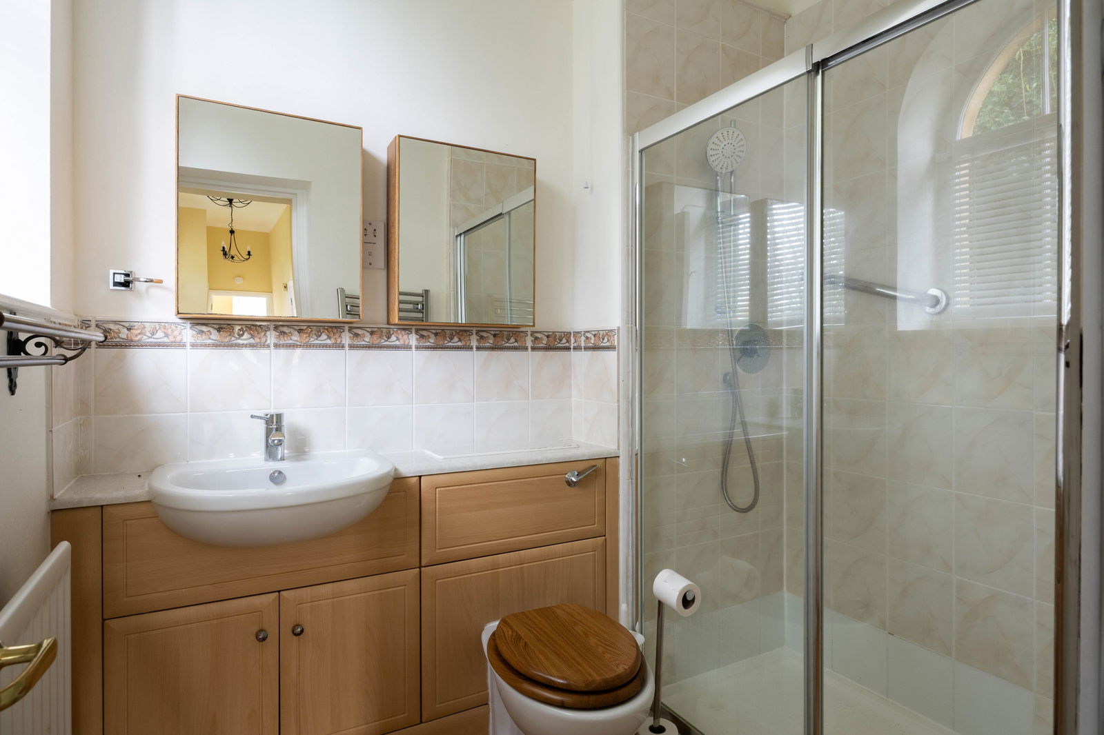 Moving through the property the hallway provides storage via two built in cupboards, and in turn gives access to two double bedrooms. Each bedroom has space for freestanding wardrobes and benefit from the morning sun due to their easterly aspect. To complete the internal accommodation, the bathroom has been finished in a neutral tone and benefits from a large walk-in shower cubicle.