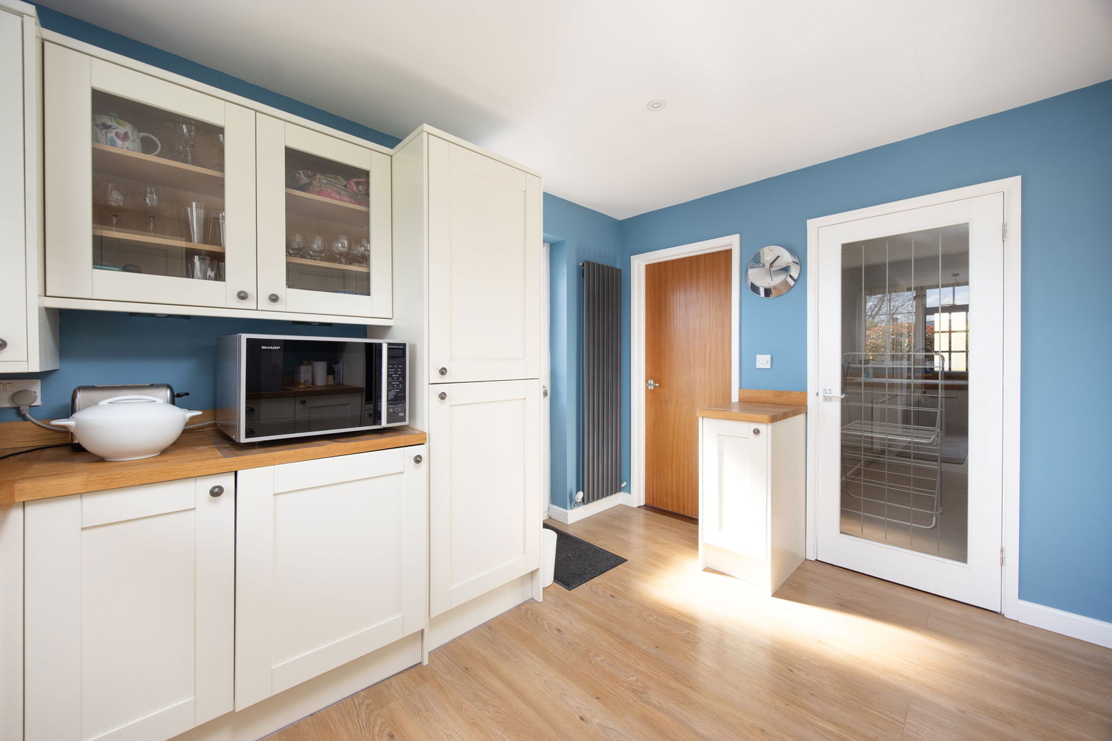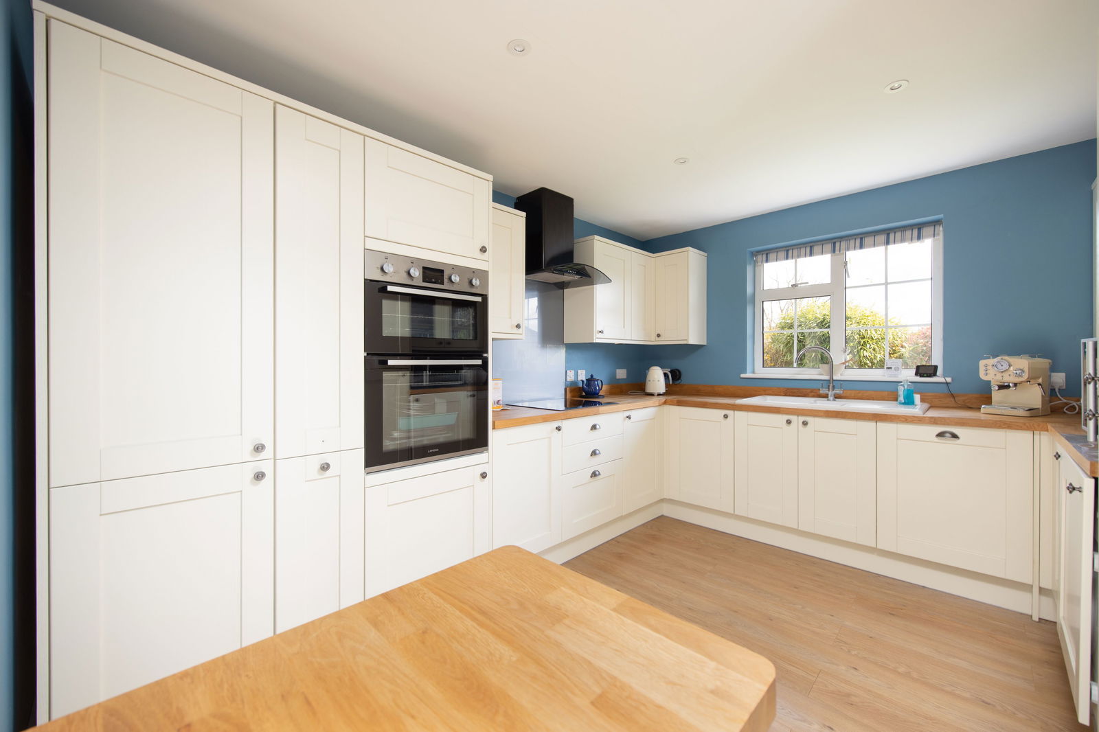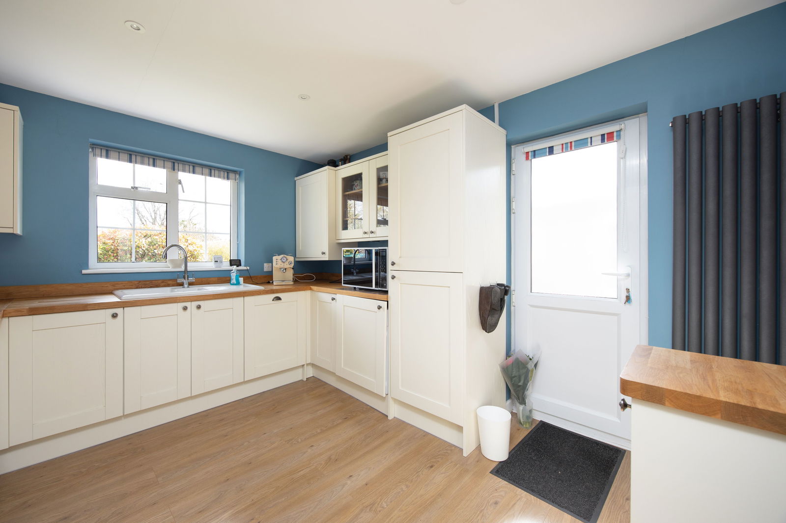 Upon entering the property there is a spacious central entrance hall which gives access to ground floor accommodation. Overlooking the front and rear garden is the triple aspect sitting room which remains light and airy throughout the day. Measuring 12’ 4” x 20’ 11”, the sitting room provides ample accommodation with views both front and rear. There is potential to extend beyond the sitting room (subject to consents) to create a modern kitchen diner / family room with access to the garden, if desired. The current kitchen comprises of modern wall and base units with a host of integrated appliances, including built in dishwasher, washing machine, fridge-freezer, double oven and electric hob.