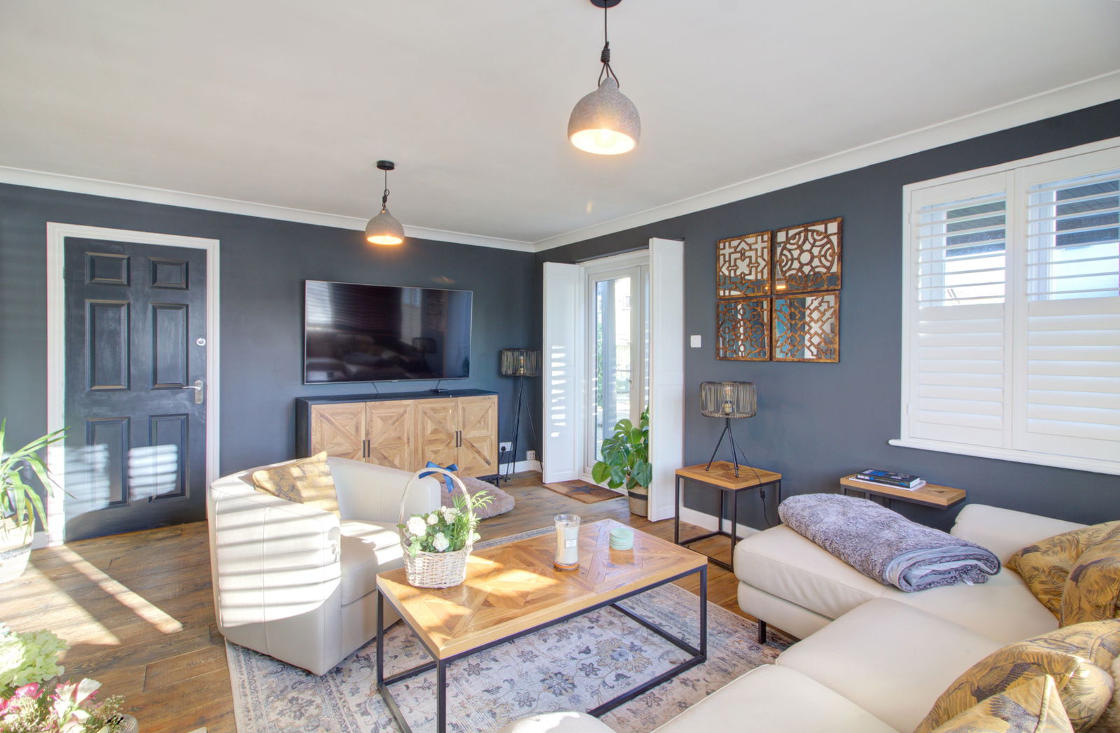 Upon entering the property, the entrance hallway gives access to a handy cloakroom / W.C and access to the integral partial garage. To the right of the hallway is the spacious open-plan kitchen / dining room. The well-appointed industrial-style kitchen showcases plenty of charm through the excellent application of solid wooden floors and various exposed metals, enveloping a high level of functionality with the use of a double stainless steel sink with moveable swan-neck tap, a free-standing double oven with plate-warming trays, open shelving, and a dishwasher in addition to the space, power, and plumbing for a large upright fridge. Measuring over 20 feet in length, there is plenty of space for a large dining table and other pieces of freestanding furniture within this room, which promotes hosting thanks to a wide doorway and easy access through into the well-proportioned sitting room, which measures 16’ 2” x 13’ 2”. Offering French doors that conveniently lead directly out onto a high quality 'weatherproof' pergola to enjoy, this sitting room features the same rich coloured solid wooden flooring as found in the kitchen, and comes complete with a fireplace with an attractive stone surround - The ideal environment within which to enjoy a cosy night in.