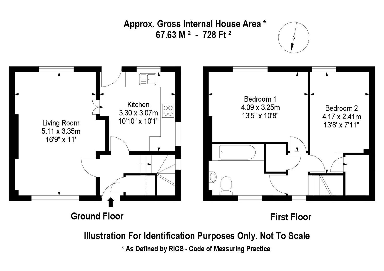 Stairs to the first floor leads to two deceptively large double bedrooms and the family bathroom. The master bedroom offers impressive proportions measuring 13’ 5” x 10’ 8” whilst bedroom two benefits from ample built in storage cupboards. To complete the first floor, the family bathroom is home to a modern white suite with bath and overhead shower.