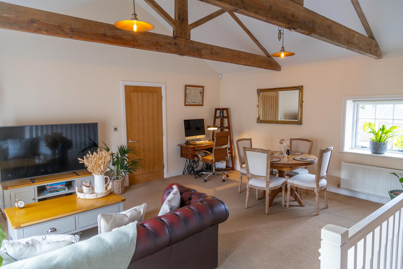 Lounge - A south facing aspect and vaulted ceiling with exposed trusses give this lovely room a light and airy feel. There is a cupboard to the corner housing the water tank and a window overlooks the rear courtyard.
