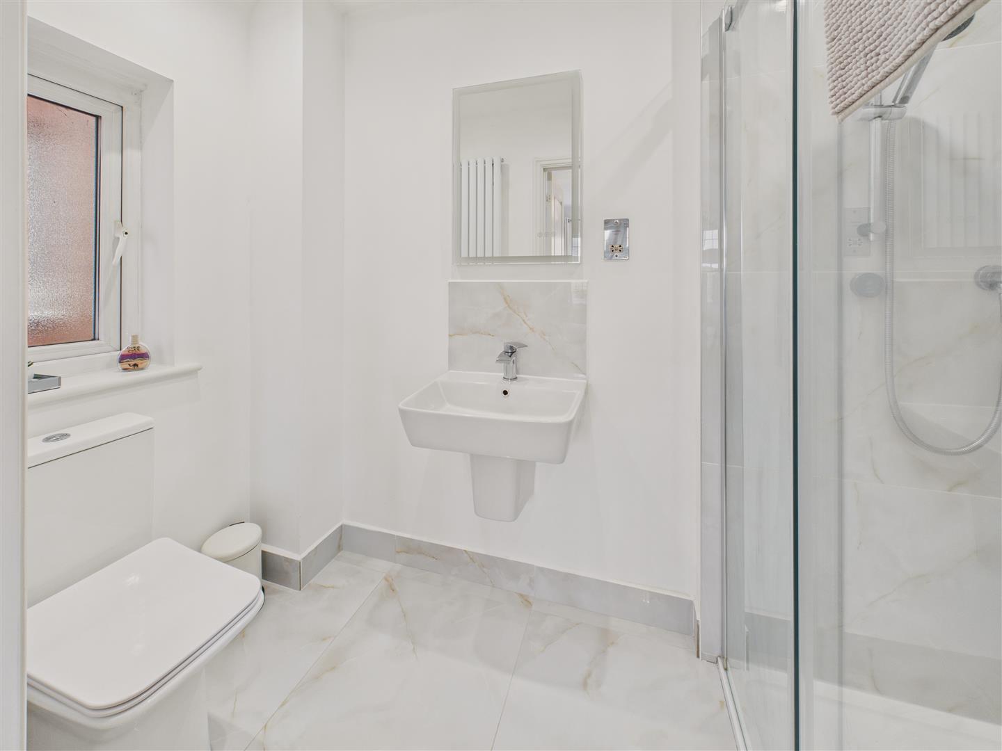 En-Suite Shower Room - With stylish suite comprising a shower enclosure, wash hand basin and low flush W.C. Tiled floor, inset spot lights and window to side.