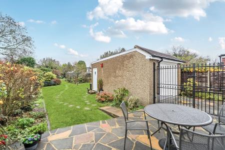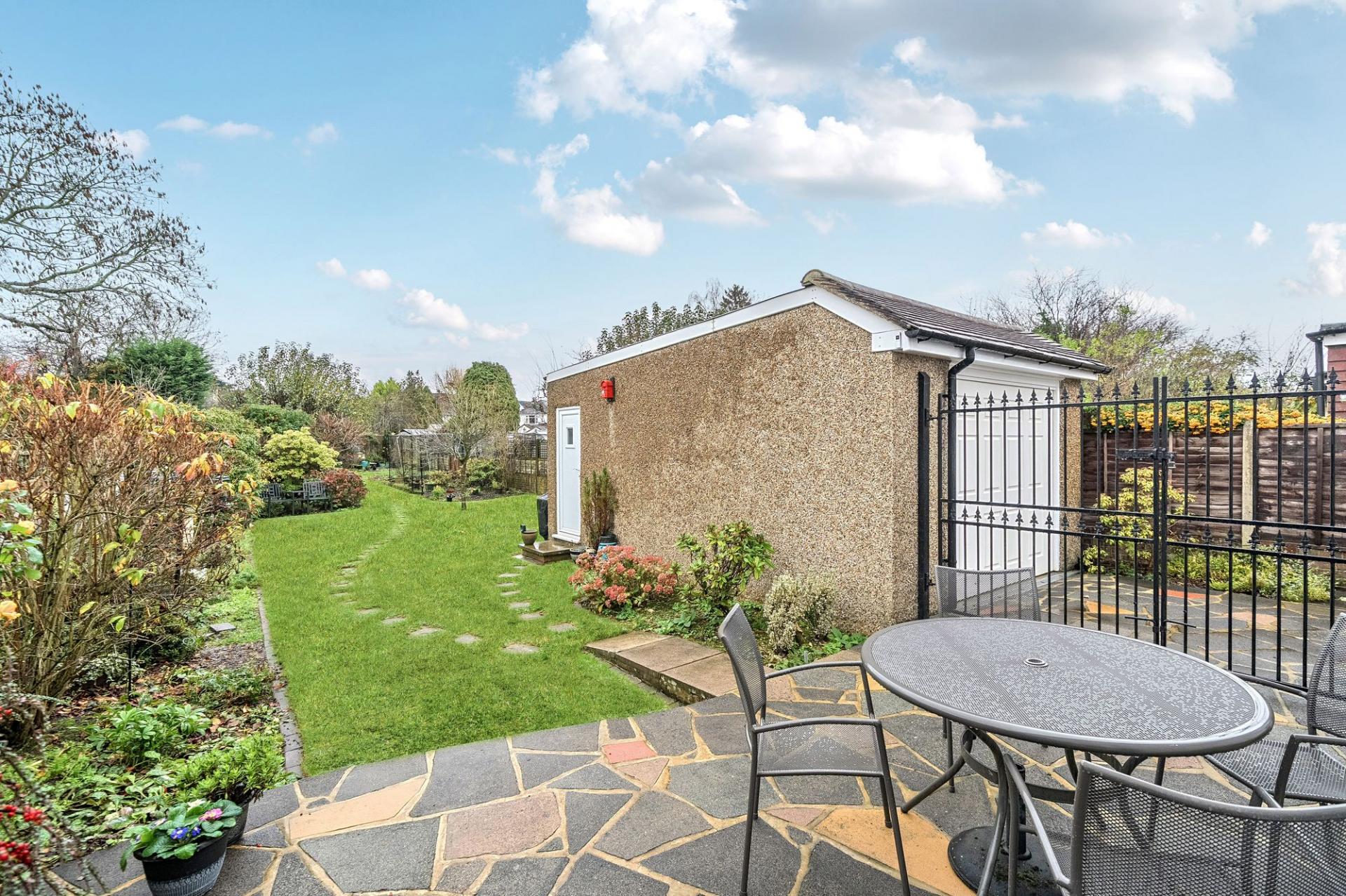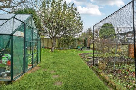 Outside, the rear garden is a real highlight of the property. The plot is large, level and thoughtfully laid out and has double gates. There is a patio area ideal for outdoor dining and summer barbecues, leading onto a mature lawn where children can play. A spacious, sun-filled green house sits in the rear garden, ideal for growing plants year-round.