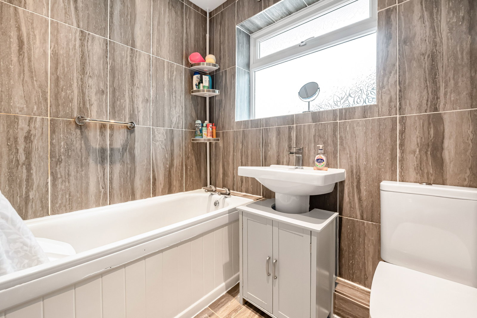 Upstairs, the property offers two generous double bedrooms alongside a third bedroom, ideal as a child’s room, guest room or home office. A family bathroom serves the first floor.