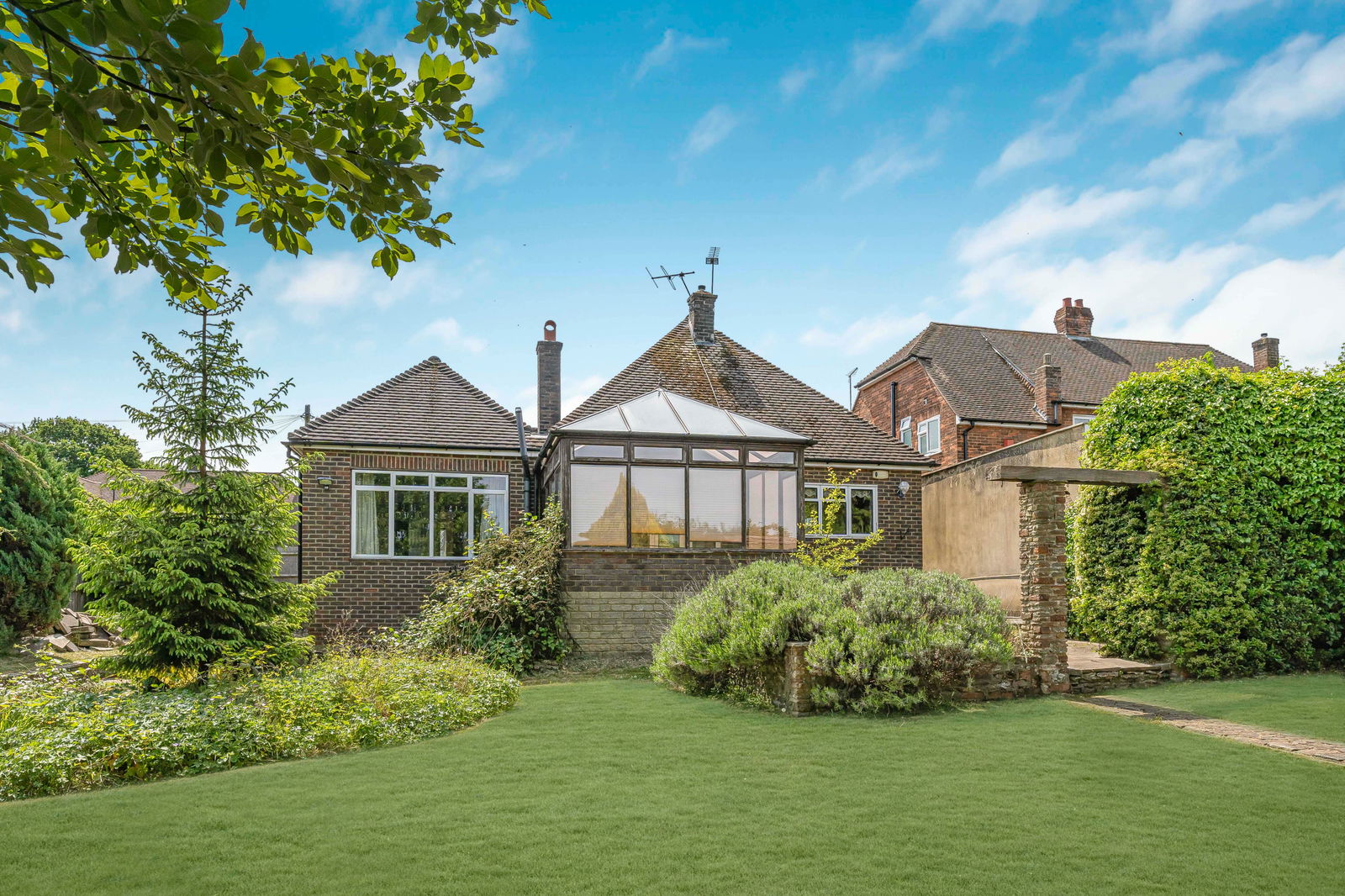 The bungalow offers three bedrooms, including a master bedroom suite complete with an ensuite shower room and a private dressing room – offering a touch of luxury and convenience. Two further bedrooms provide ample space for family, guests, or a home office.