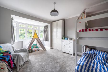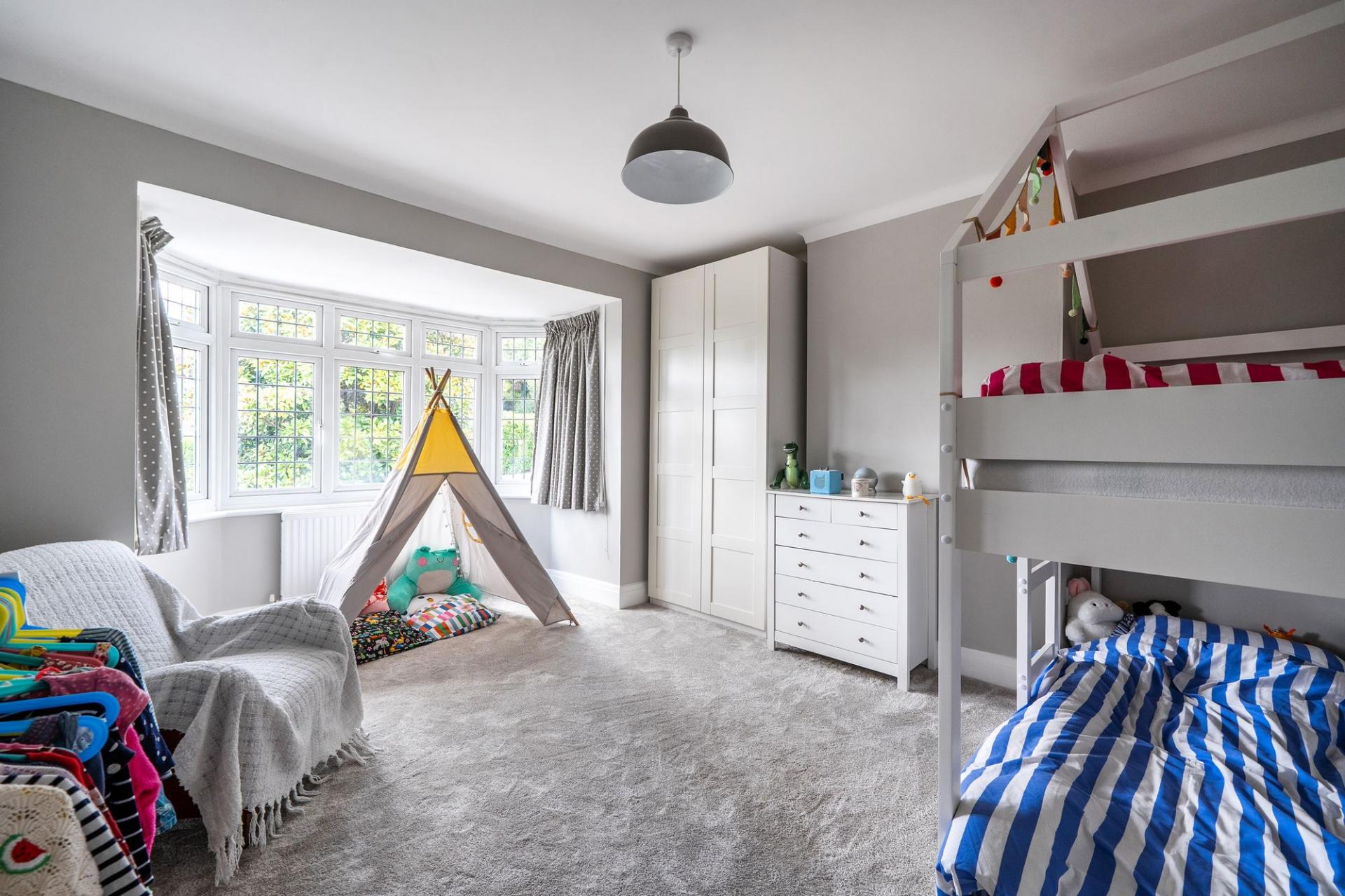 Upstairs, the first floor offers three bedrooms. The rear principal double bedroom benefits from sliding doors to a balcony, where you can enjoy stunning morning views across the Downs. Another spacious double, with a bay window, lies at the front of the property, while a charming single bedroom is ideal for younger children or as a nursery. A modern family bathroom with separate shower provides comfort and convenience for busy mornings. The top floor opens up to a large fourth bedroom, complete with Velux windows framing views over the Downs, making it an inspiring retreat for older children or guests.