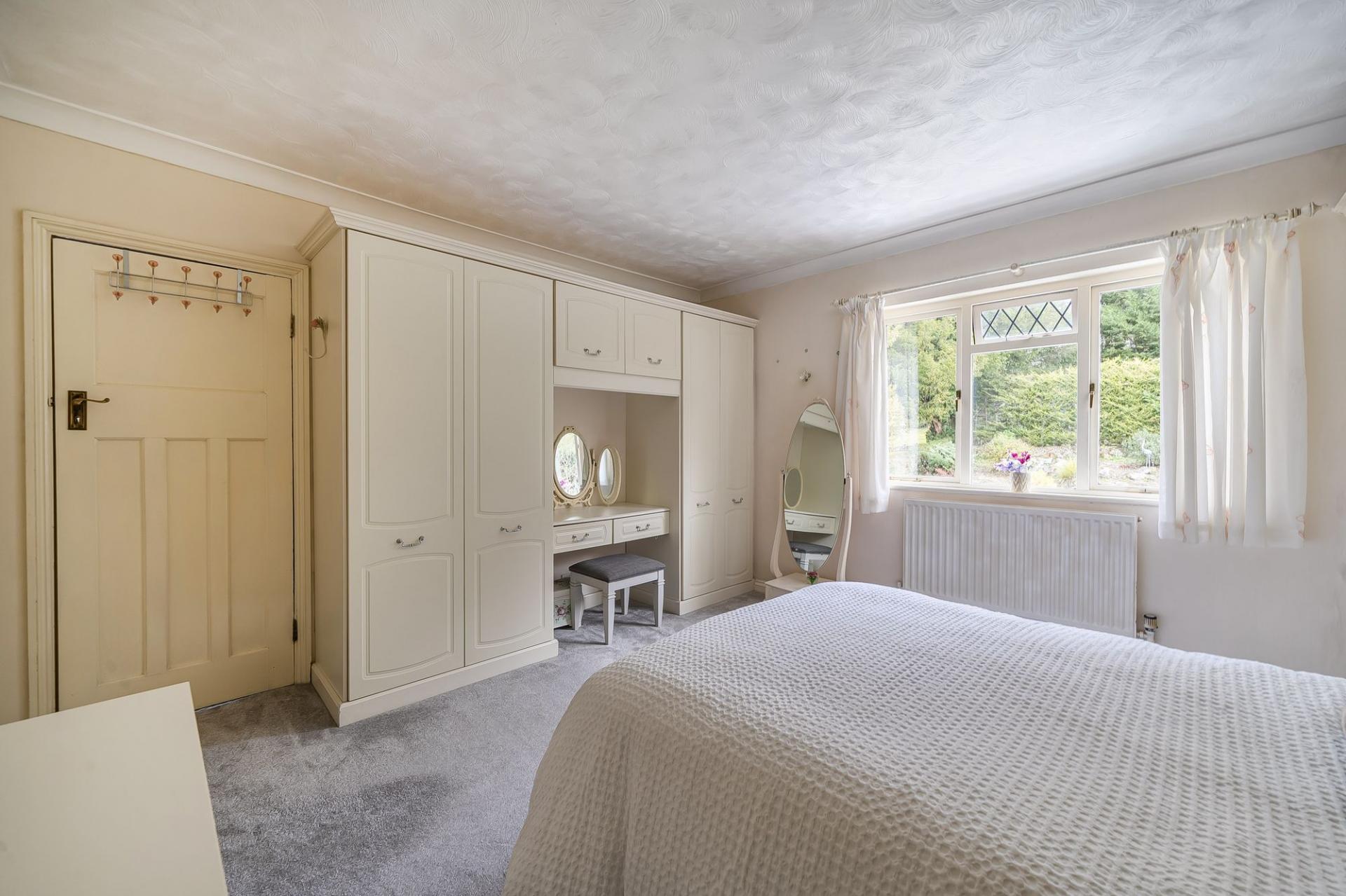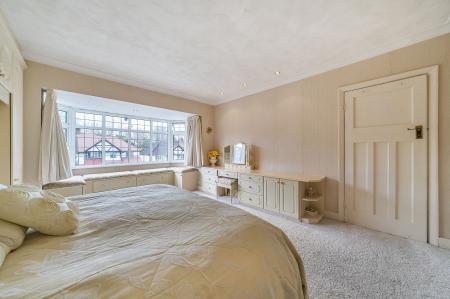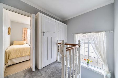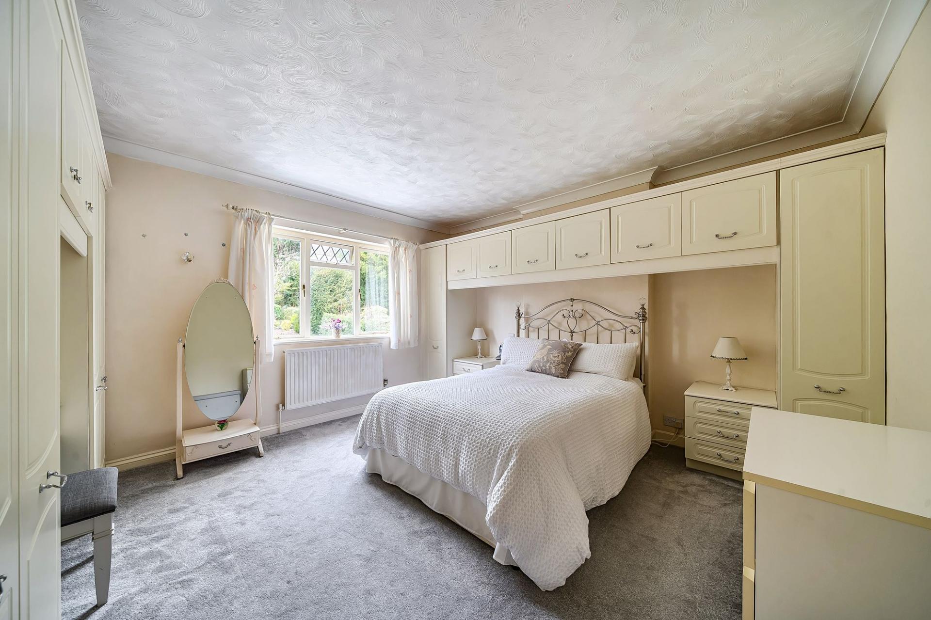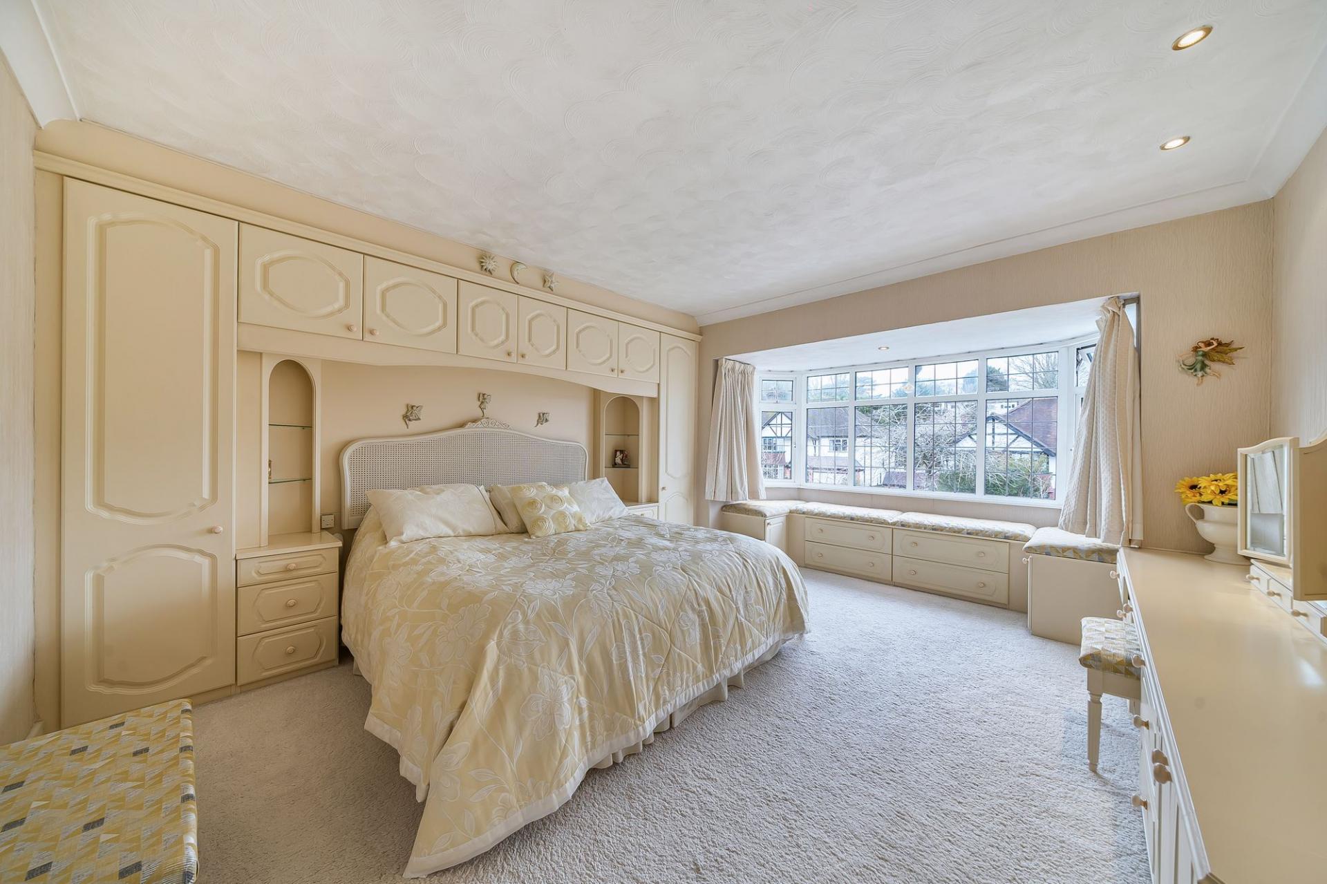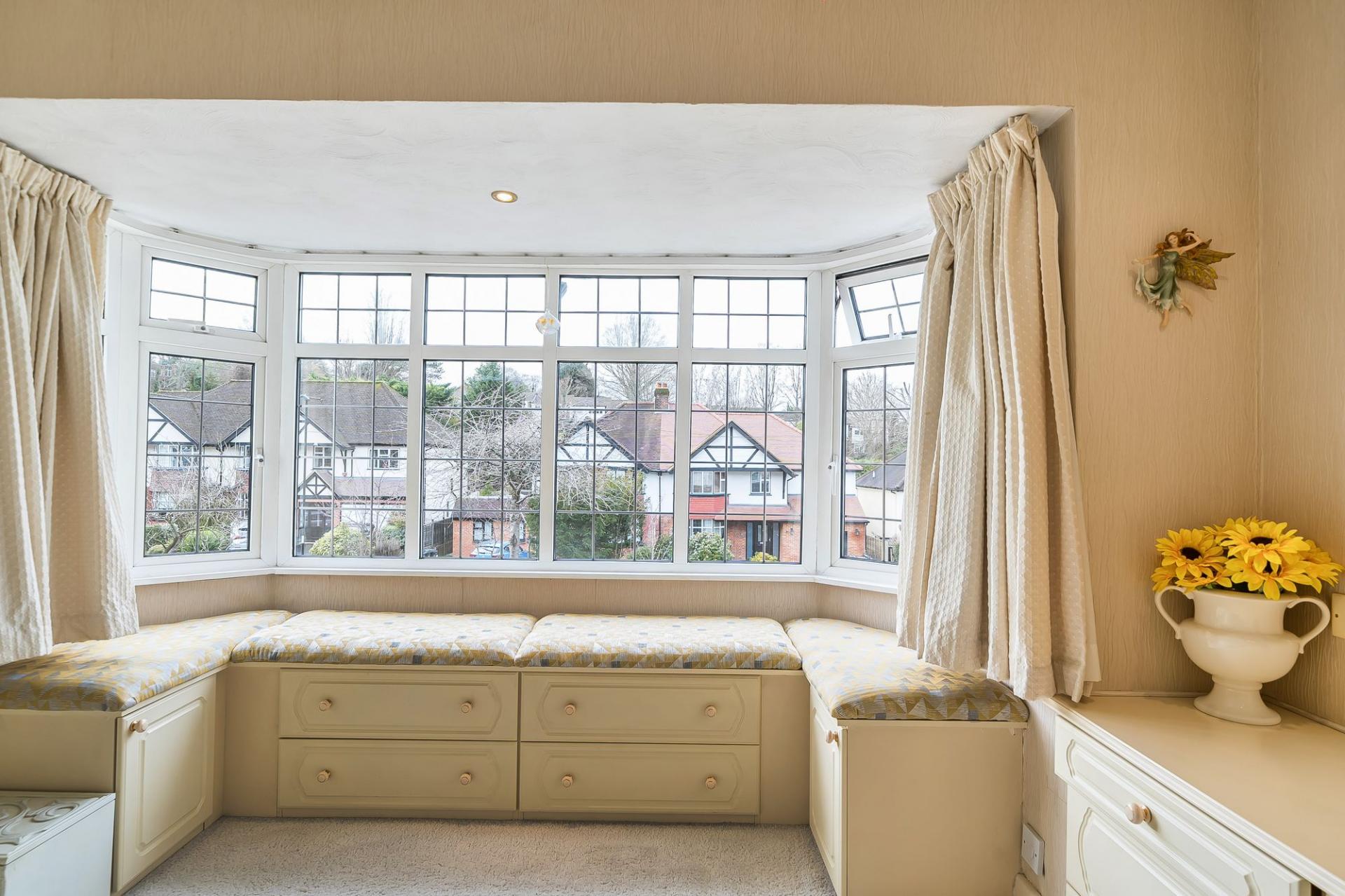 Upstairs, the principal bedroom is a lovely feature, with a large bay window to the front complete with window seat, fitted wardrobes, over‑bed cupboards, drawers and a dressing table, providing excellent storage. There are two further spacious bedrooms, each offering flexible use for children, guests or a home office. The sizeable family bathroom includes a large jacuzzi‑style bath, creating a relaxing space to unwind.