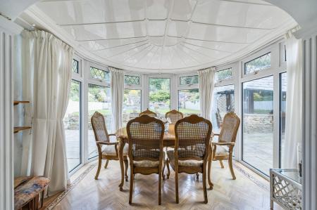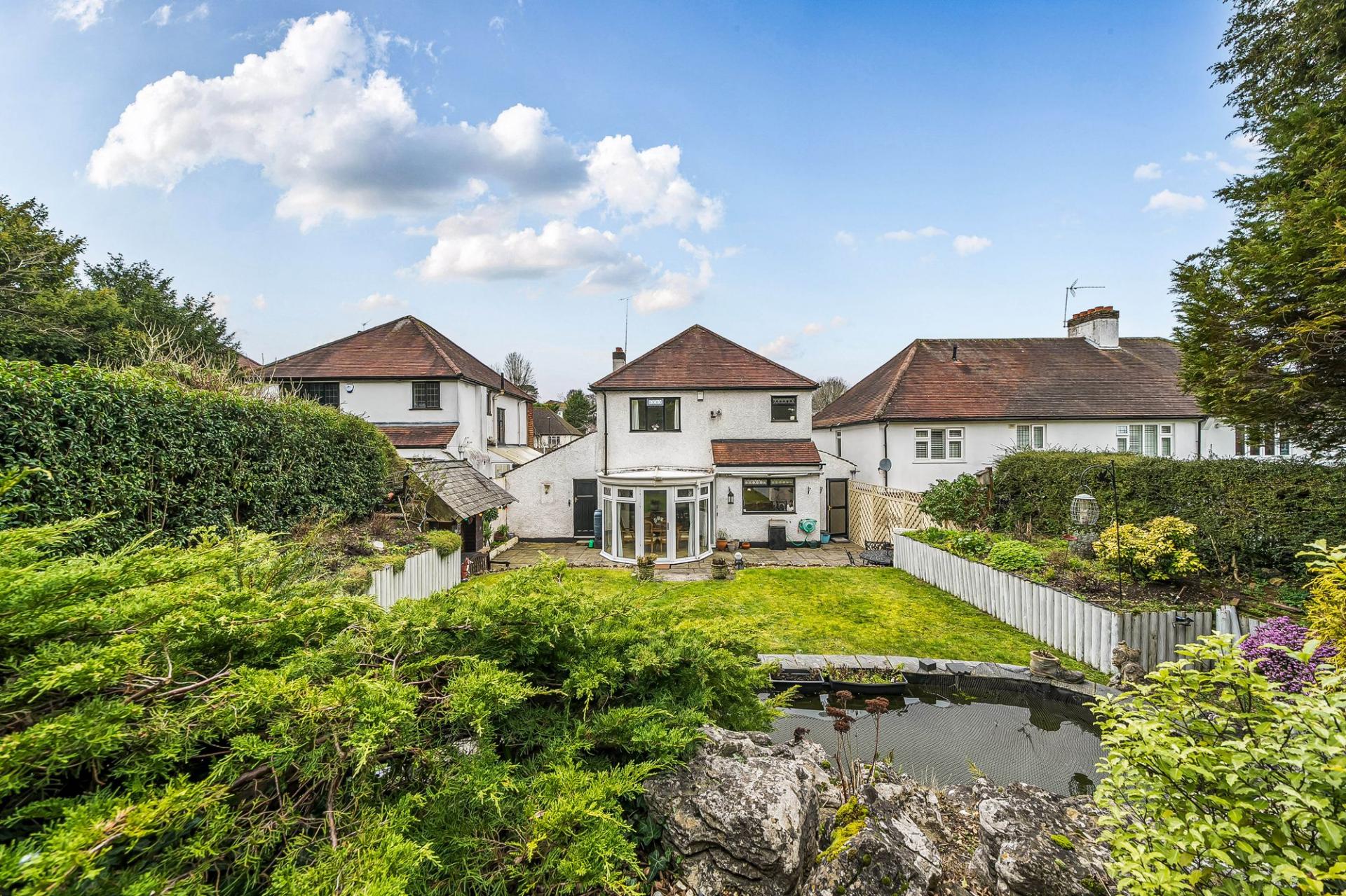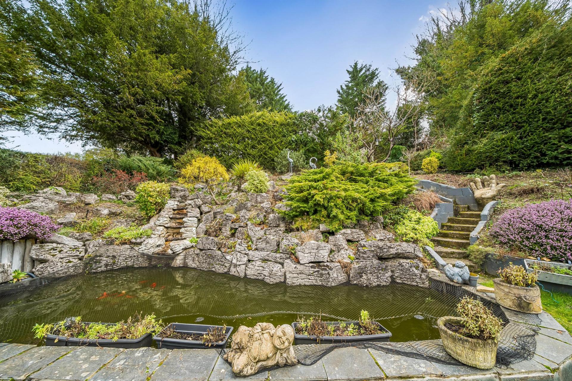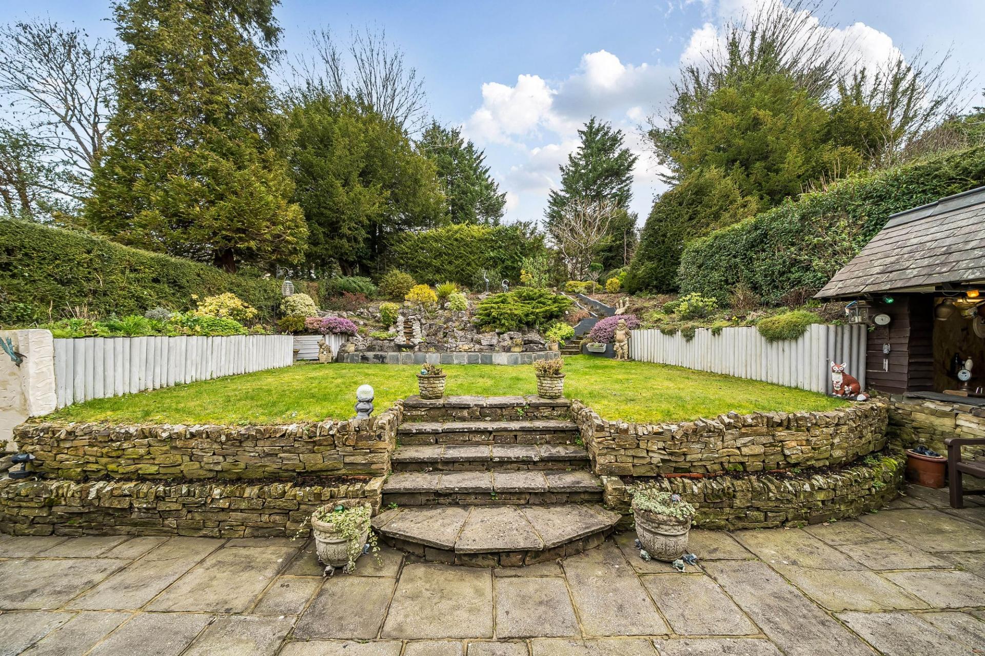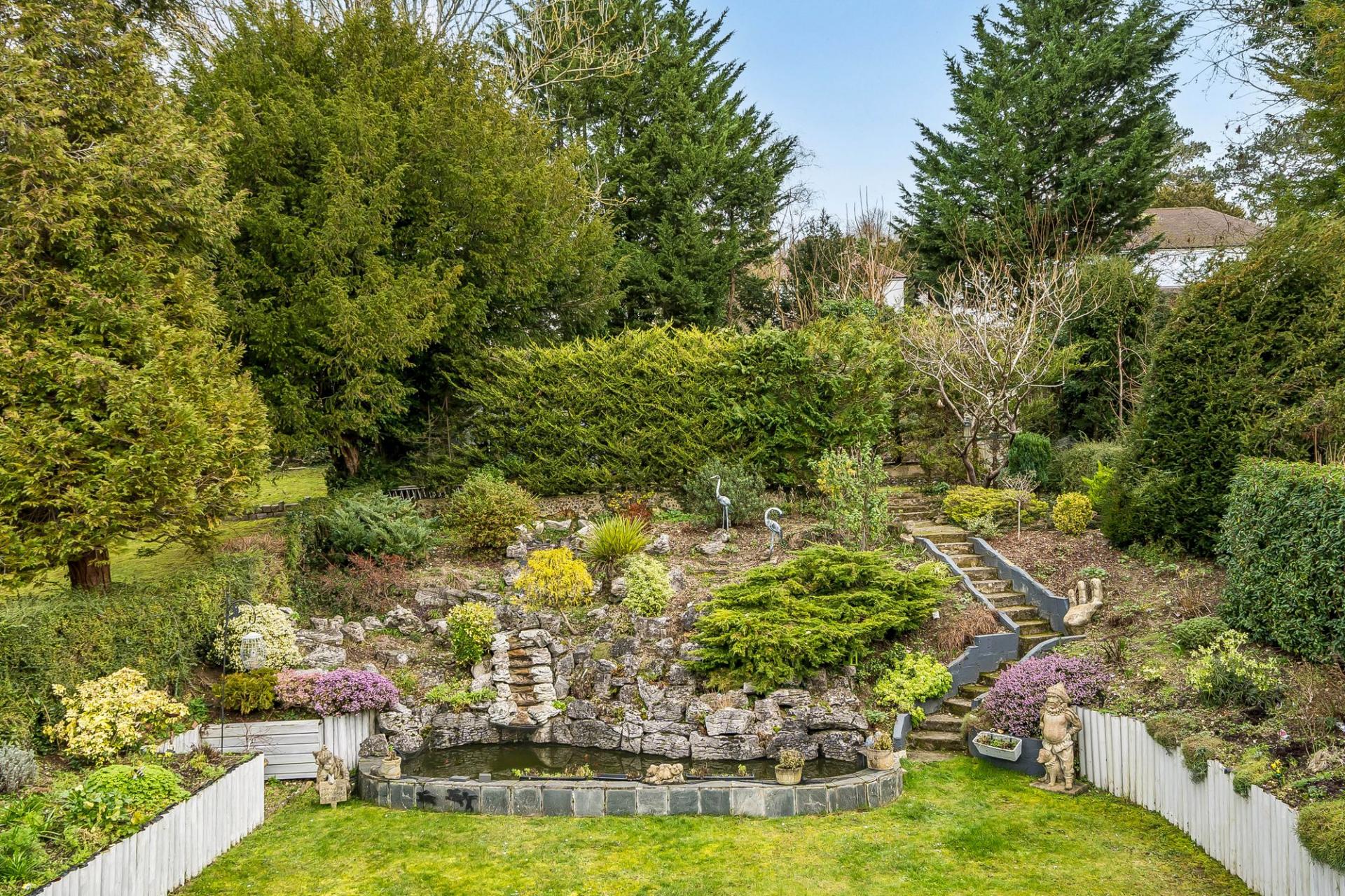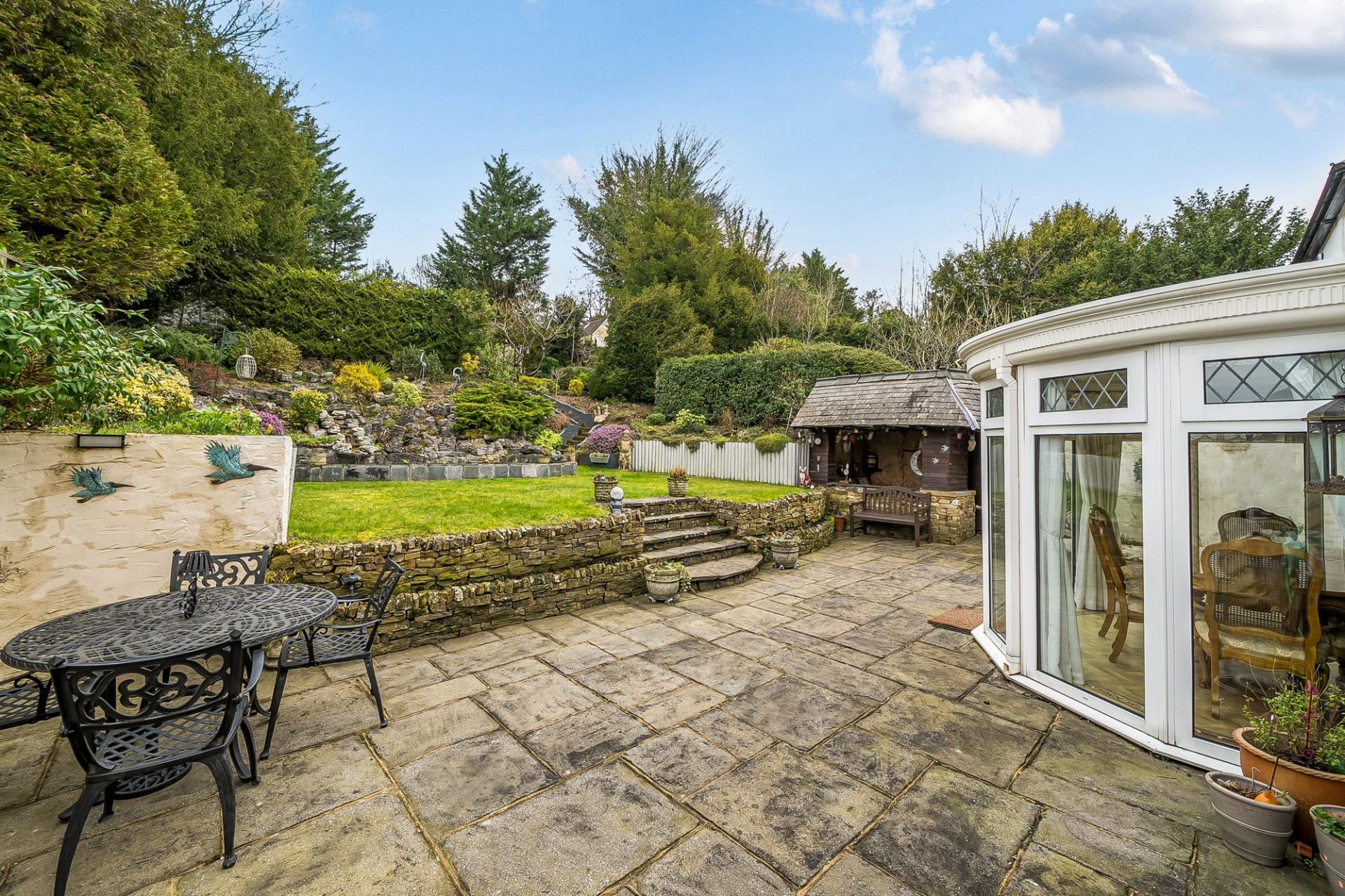 Outside, the rear garden is a real highlight – beautifully maintained, mature and secluded. A wide patio area provides ample room for outdoor dining and entertaining, and complete with bar and a tilled roof. The patio are a leads to a lawned area with an attractive waterfall feature, rockery and steps up to a further garden section with greenhouse. This tiered, well‑established garden offers year‑round interest and a peaceful backdrop. To the front, a large driveway provides generous off‑street parking and leads to an extended garage set to the side of the house.