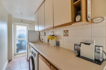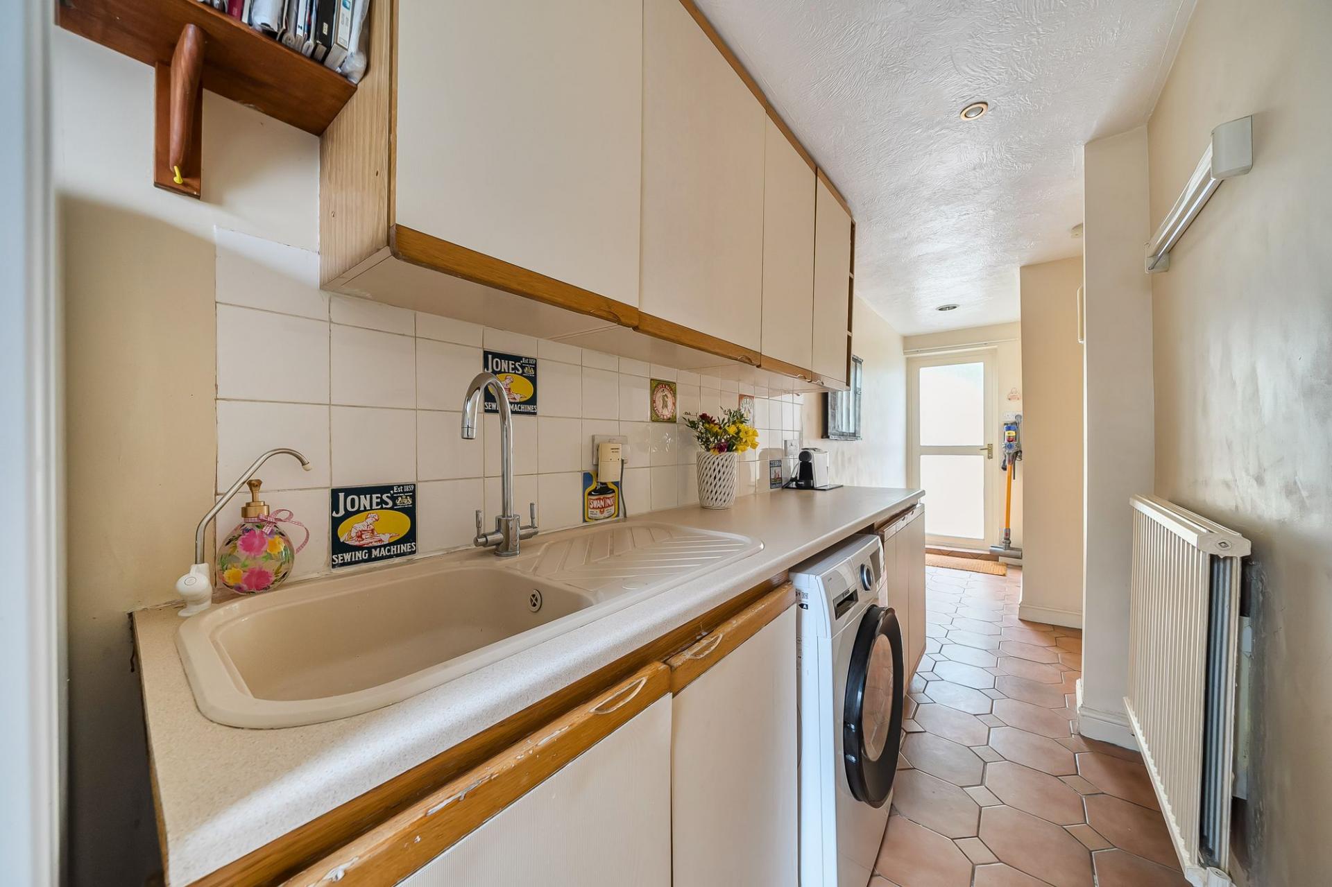 The kitchen is fitted with a good range of units and offers space for a range cooker, together with integrated fridge, dishwasher and microwave. A rear‑facing window overlooks the garden, and there is a useful utility room with space for further appliances and doors giving access to both the front and rear of the property, adding to the home’s practicality.