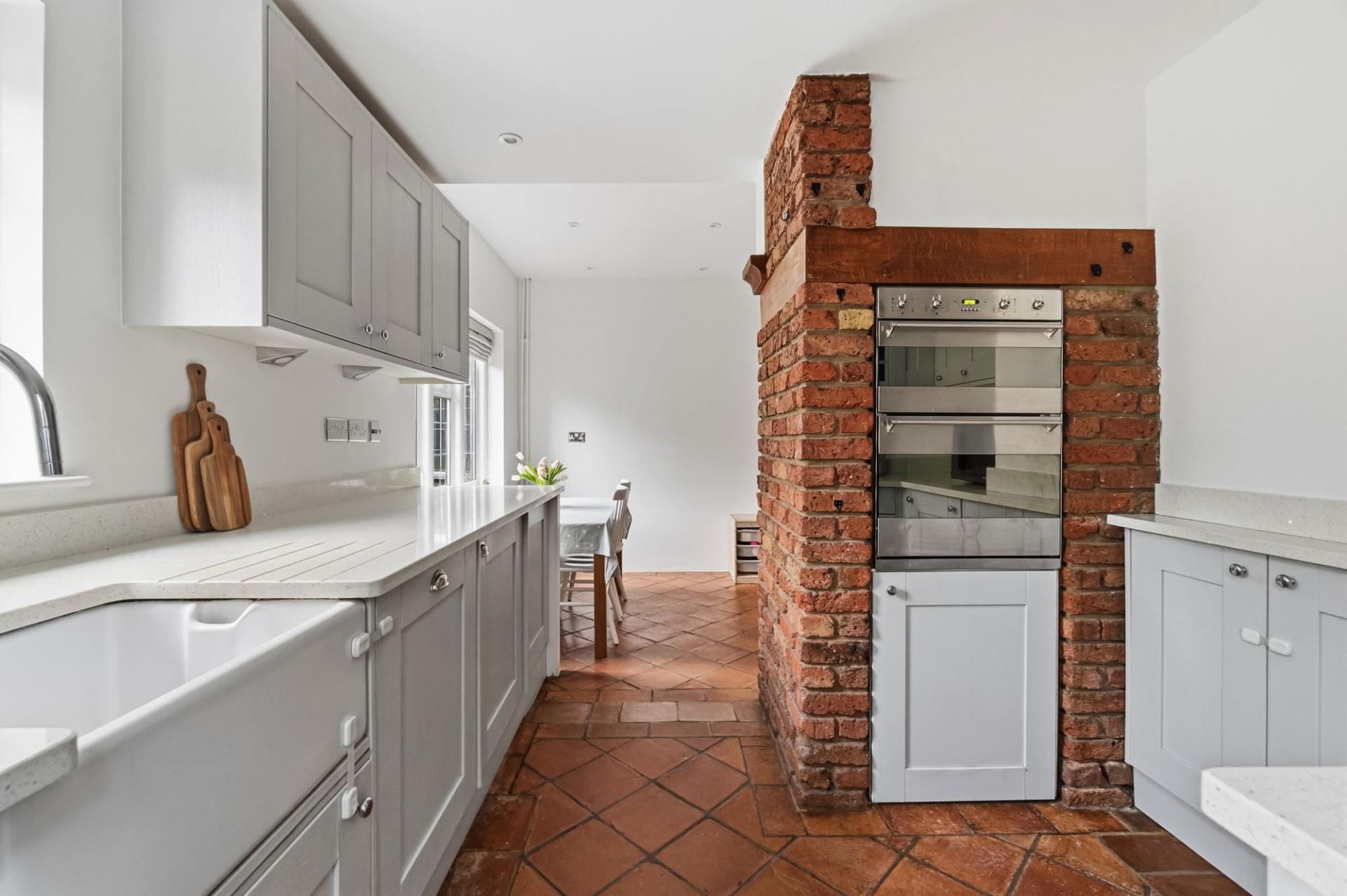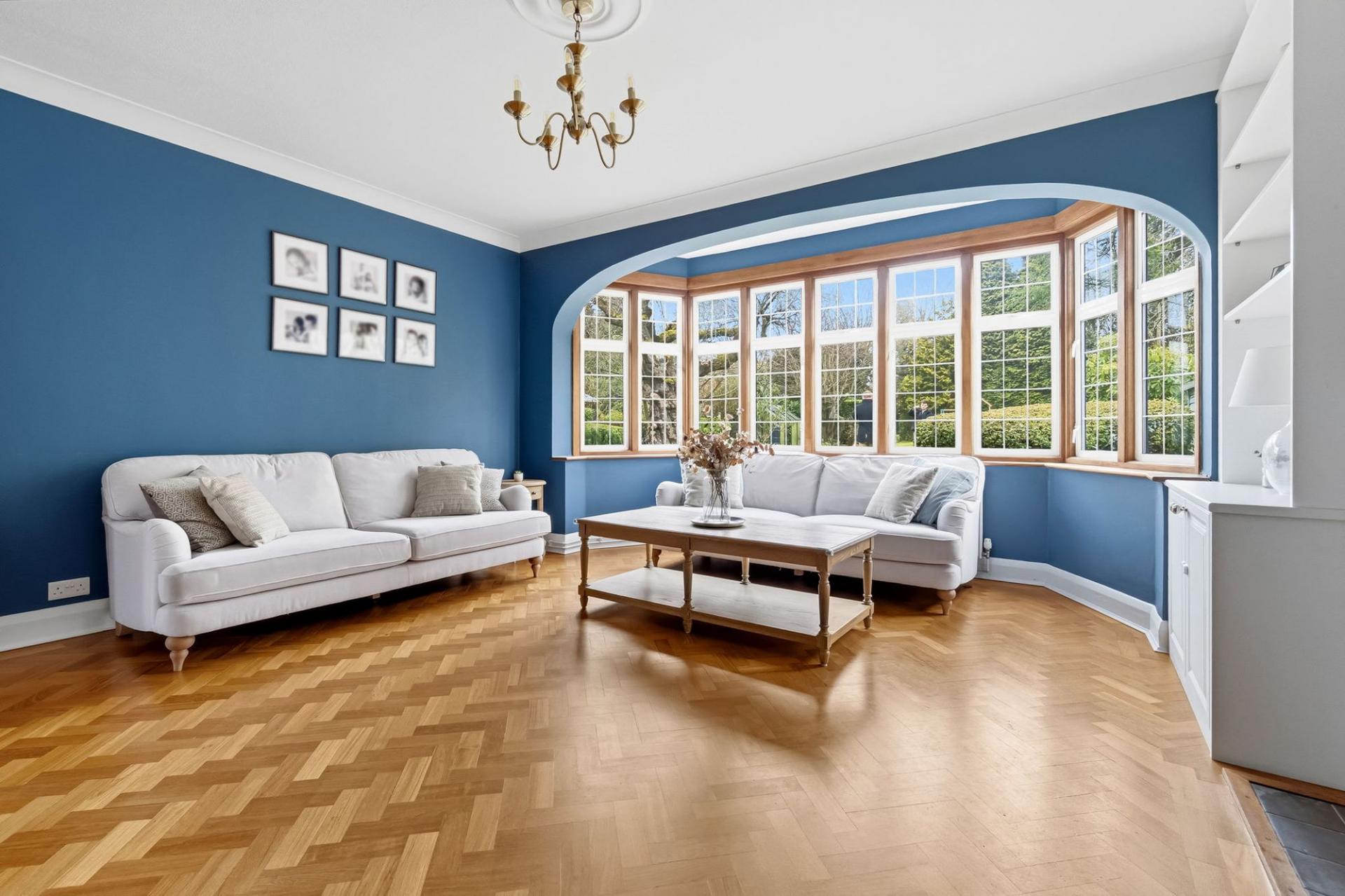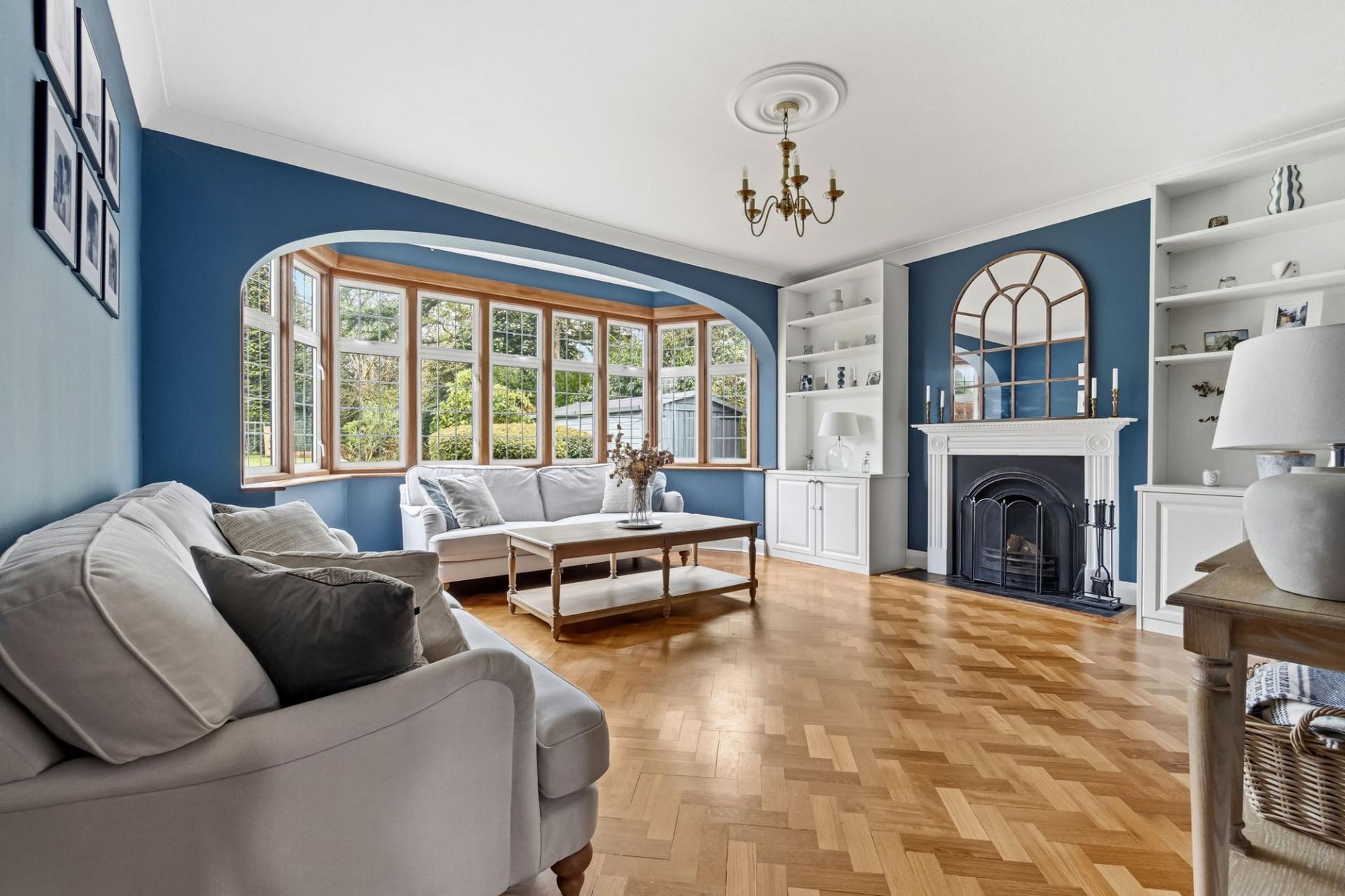Stepping inside, you are welcomed by a beautiful entrance hall, complete with parquet flooring. To your right, a spacious dining room with a striking brick fireplace provides an elegant setting for family gatherings and entertaining guests. To the rear, the large sitting room enjoys wonderful views across the garden, with its feature fireplace and generous proportions creating a perfect space to relax and unwind.