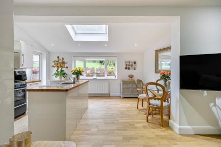 The heart of the home lies to the rear, where an extended and beautifully appointed kitchen/dining/family room offers a superb space for modern family living. The well-fitted kitchen includes a range of units, a central island, and integrated fridge/freezer. A skylight and window to the rear ensure the room is bright, while a side access door adds practicality. The dining and seating areas flow effortlessly, allowing the whole family to gather for meals, homework or relaxing together. Wide doors open directly onto the garden, making it particularly appealing during the summer months.