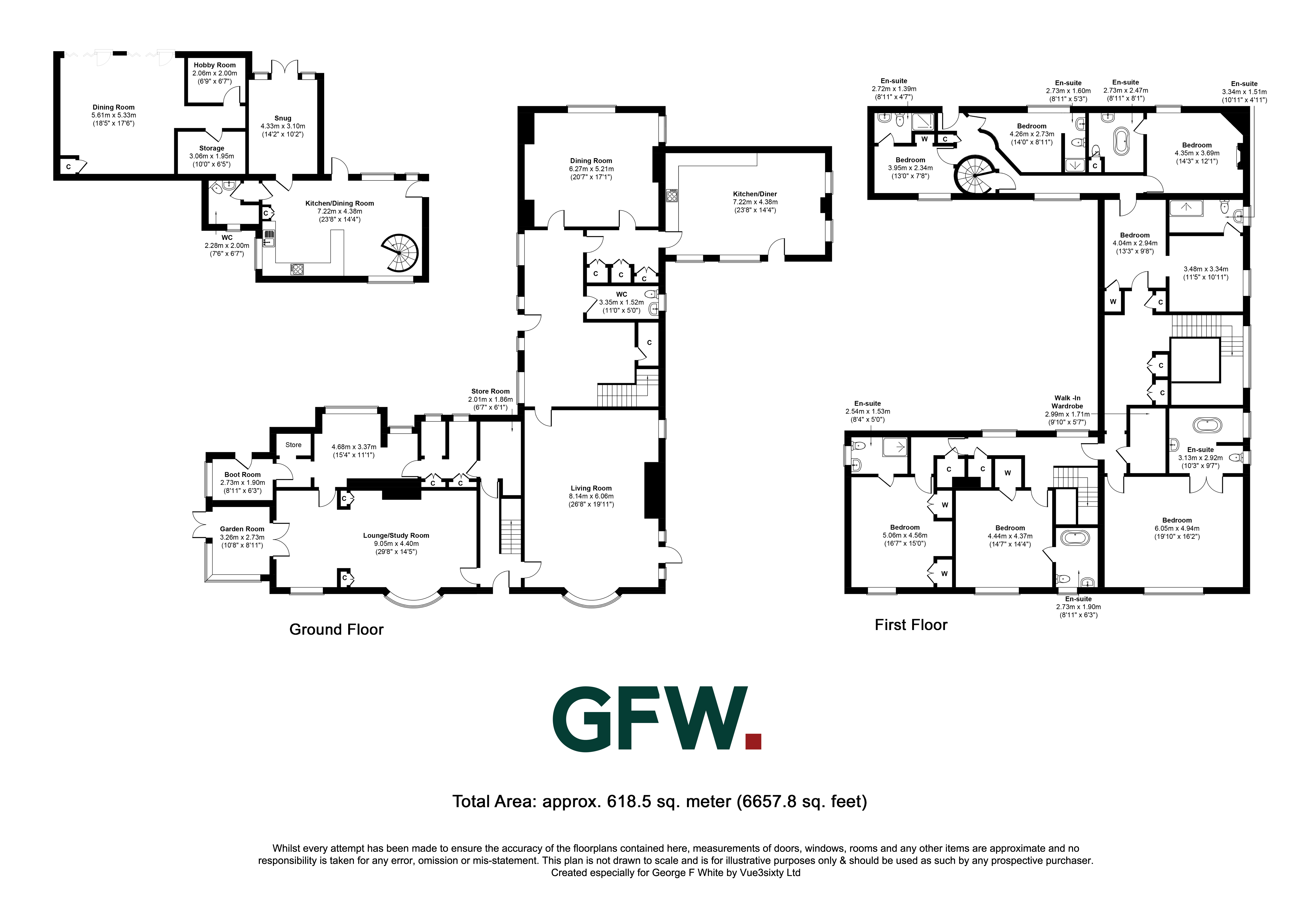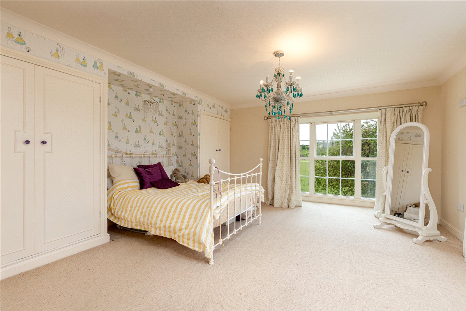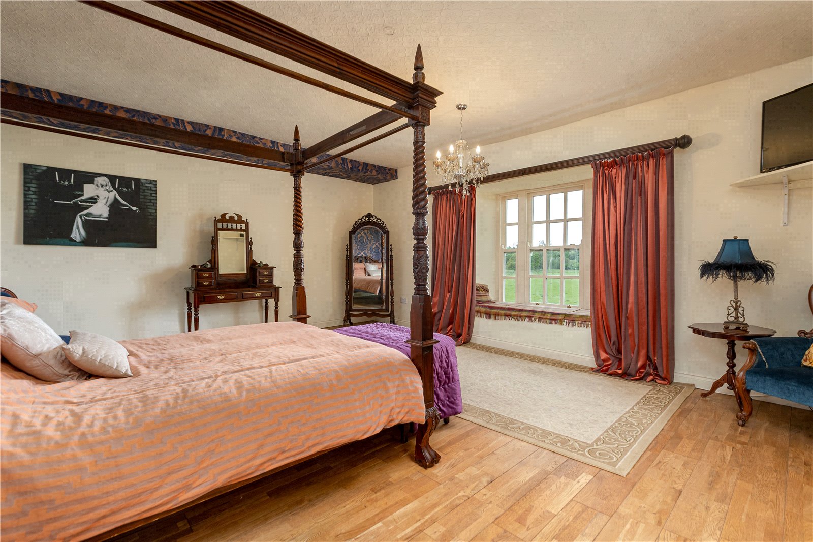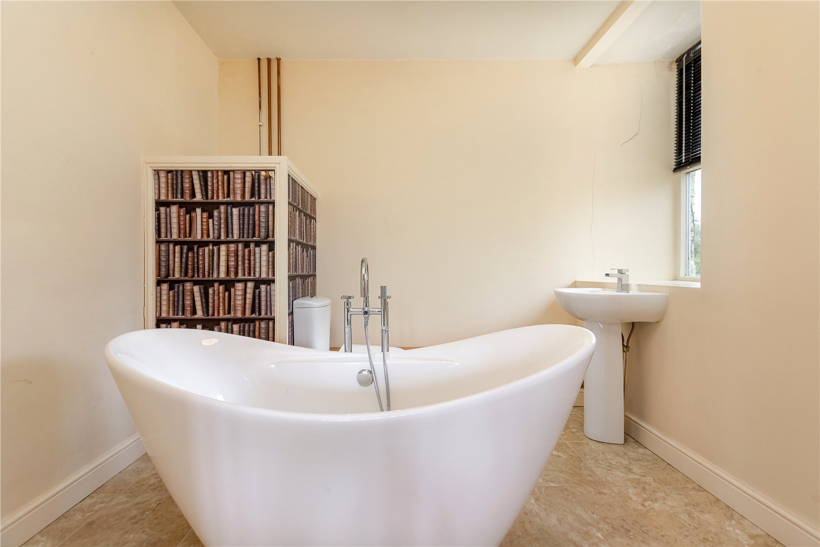 To the first floor of the main house, there are four double bedrooms, all of which feature en-suite facilities and a variety of built in storage and storage cupboards. The main bedroom, however, offers a full suite, with double doors leading to a full, en-suite bathroom, with a freestanding bath, wash hand basin set upon a vanity and low level WC. The floor is tiled, while a plain glass window enjoys views over the garden. The main bedroom also boasts a walk in wardrobe.