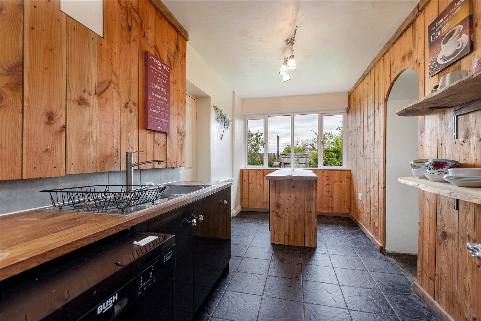 The kitchen area has a wood effect floor, while the dining area is laid with slate flooring, having a wooden partition which offers wine storage, separating the rooms. There are windows which face the side and ample space for a dining table and appliances.