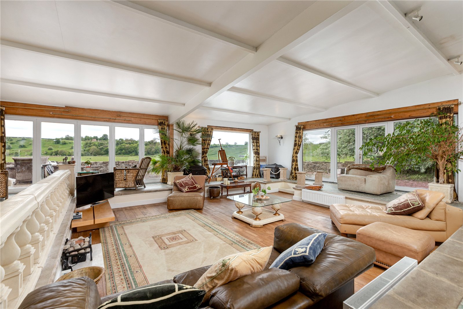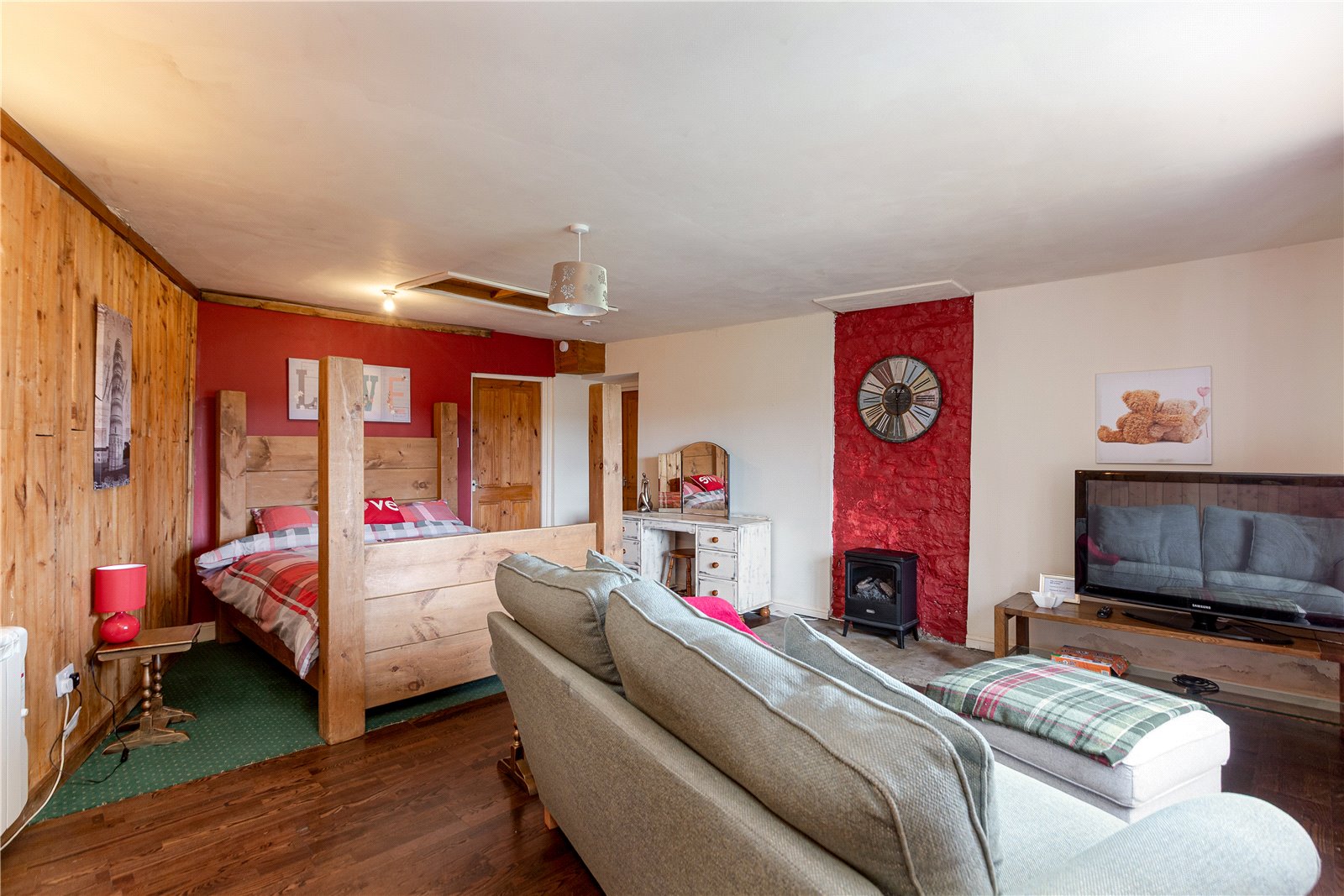 The living accommodation is over the former swimming pool and is open plan and spacious, with lovely views to three sides. The kitchen area is fitted with modern base units and a small island, all of which are topped with contrasting working surfaces, which extends into an upstep splashback. There is a freestanding aga, alongside an electric oven and hob, with a stainless steel extractor over. The island unit provides seating for informal dining, while the floor is tiled up to the living space, where the floor is laid with wood effect flooring and bounded tiles. The living room offers ample space for a living and dining room and the scope of the room allows for a degree of flexibility in terms of the layout.