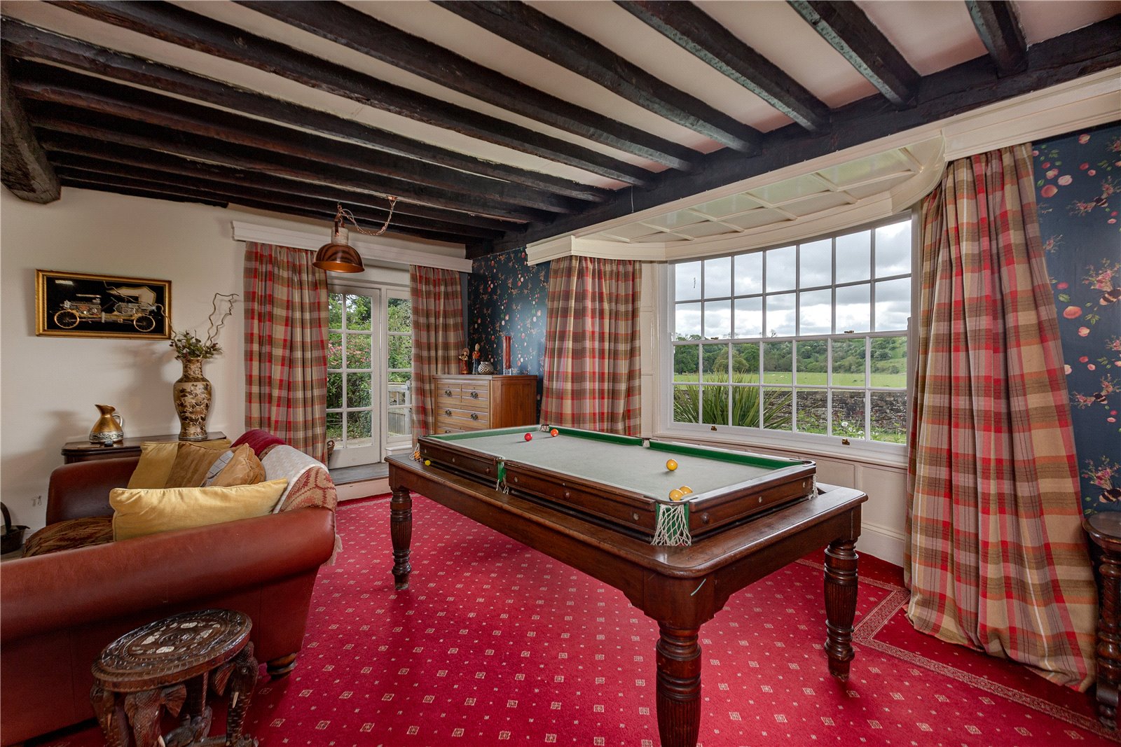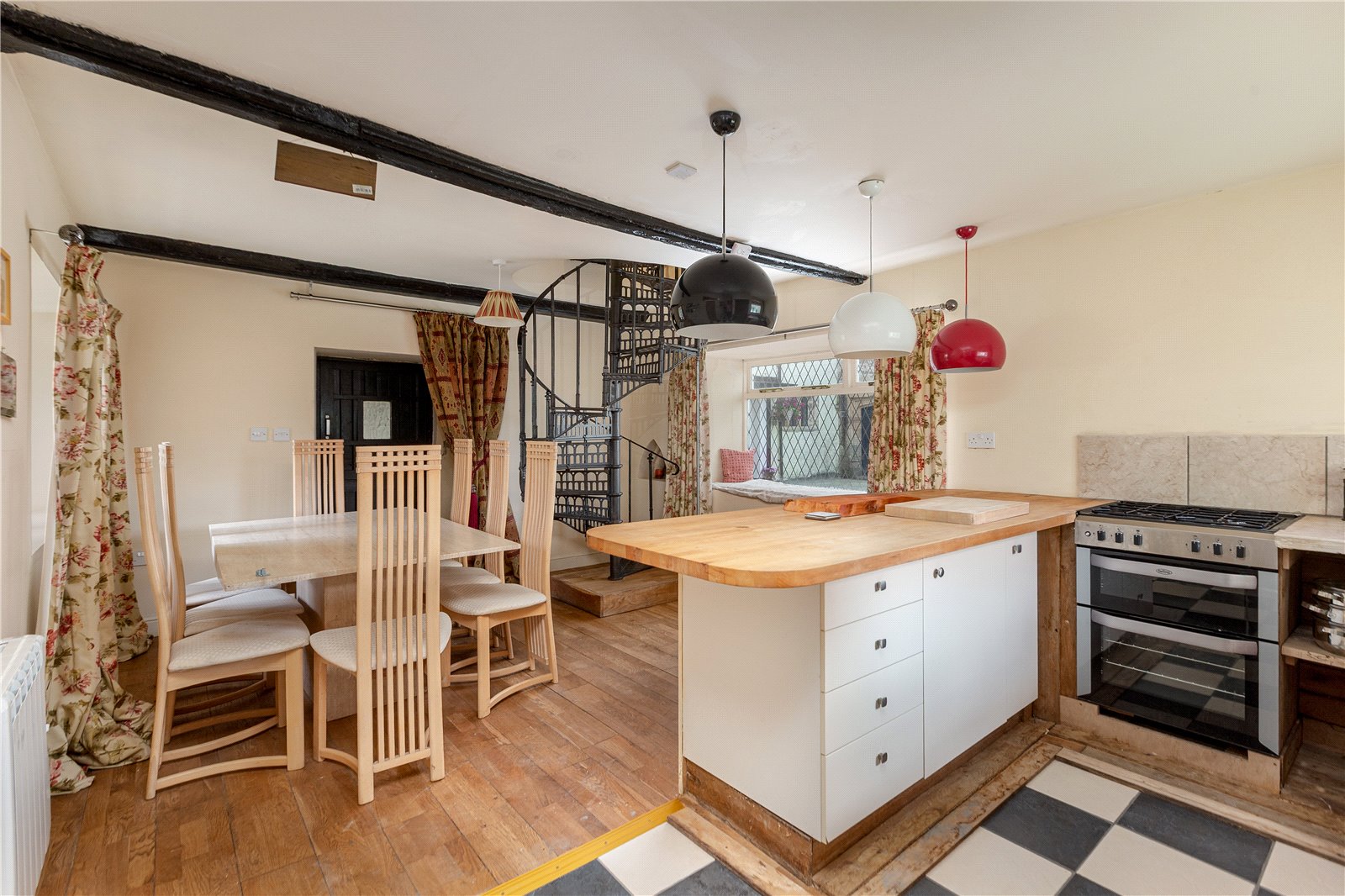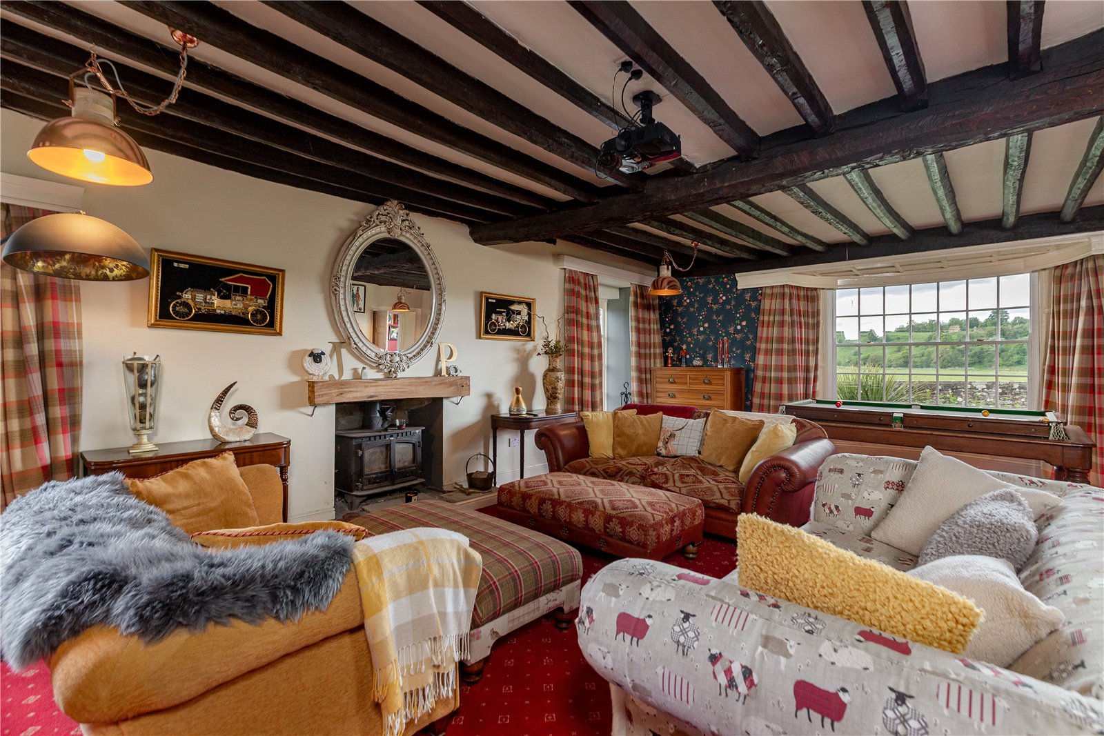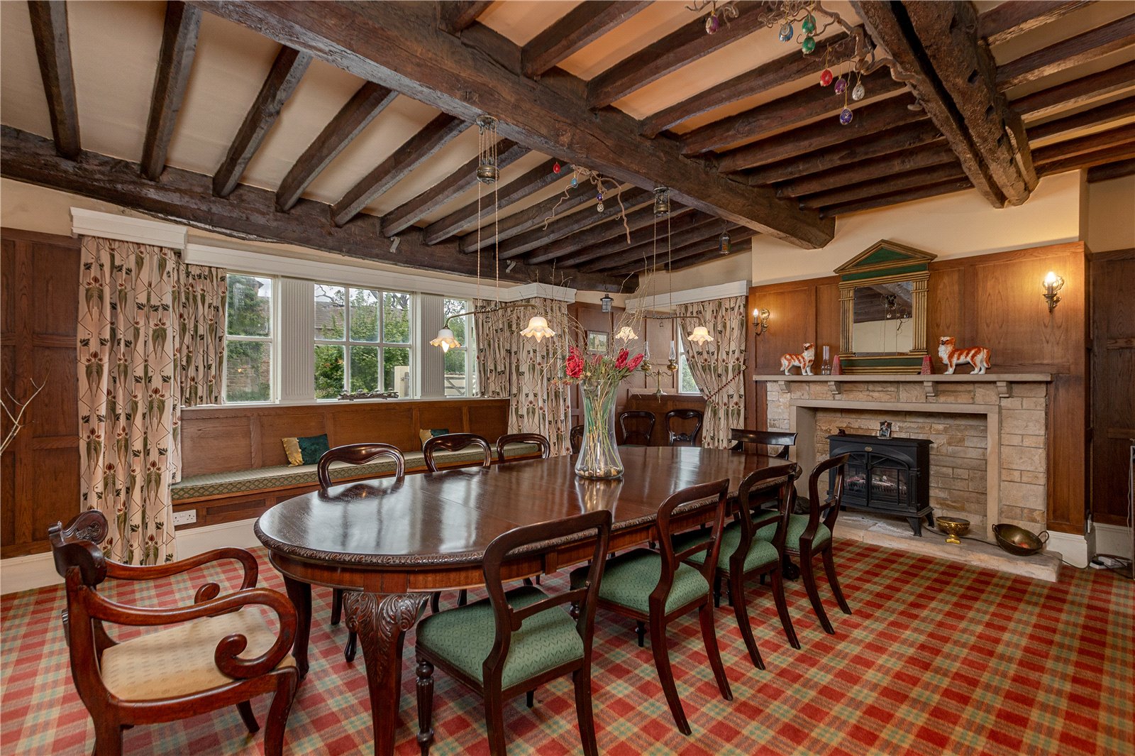 To the left hand side, lies the formal dining room, which offers a front aspect view with a window and window seat, traditional wood panelling to the walls and beams to the ceiling. The dining room is warmed by a multi fuel stove, which is recessed into a stone fireplace, with a hearth and mantel. This handsome room boasts ample space for dining furniture to facilitate a family meal.