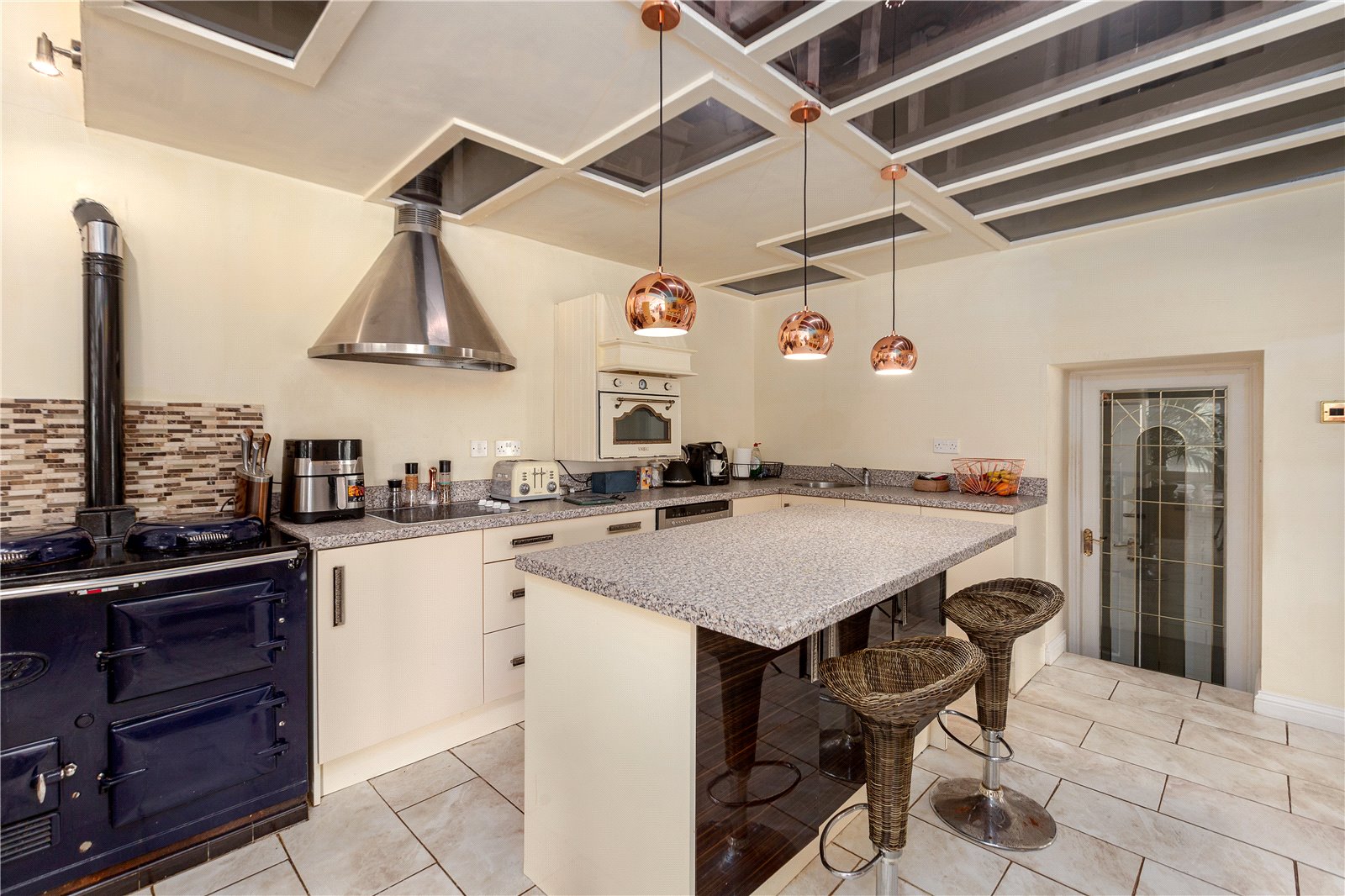 From here there is the impressive country style kitchen, which extends into an informal dining area. Fitted with a good range of wooden wall and base units, which are topped with contrasting granite working surfaces, with upstep splash back. The worktops incorporate a double French Butlers sink which has a pleasant front view aspect. There is also a traditional cream aga which is recessed into an inglenook with exposed brick chimney breast and tiled splash back. A central island unit houses a conventional range style oven with a gas hob, having an extractor overhead. The island unit is also topped with granite working surface and offers extra space for cooking.