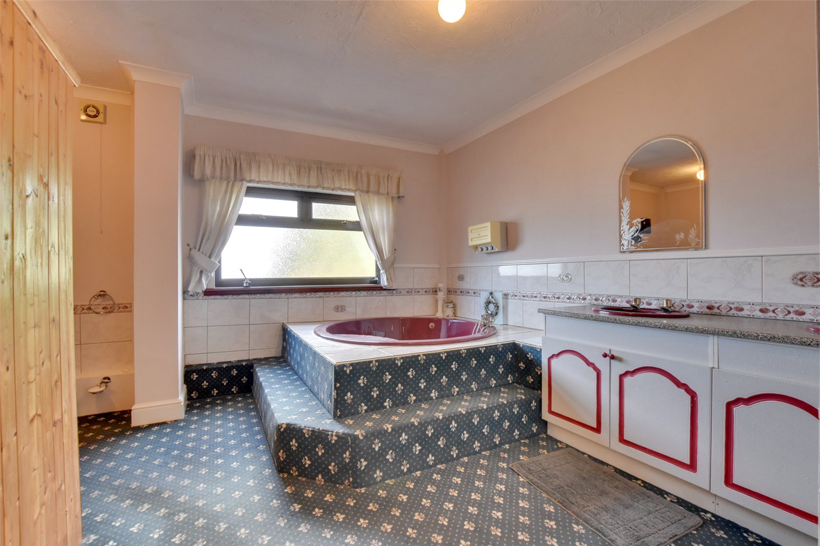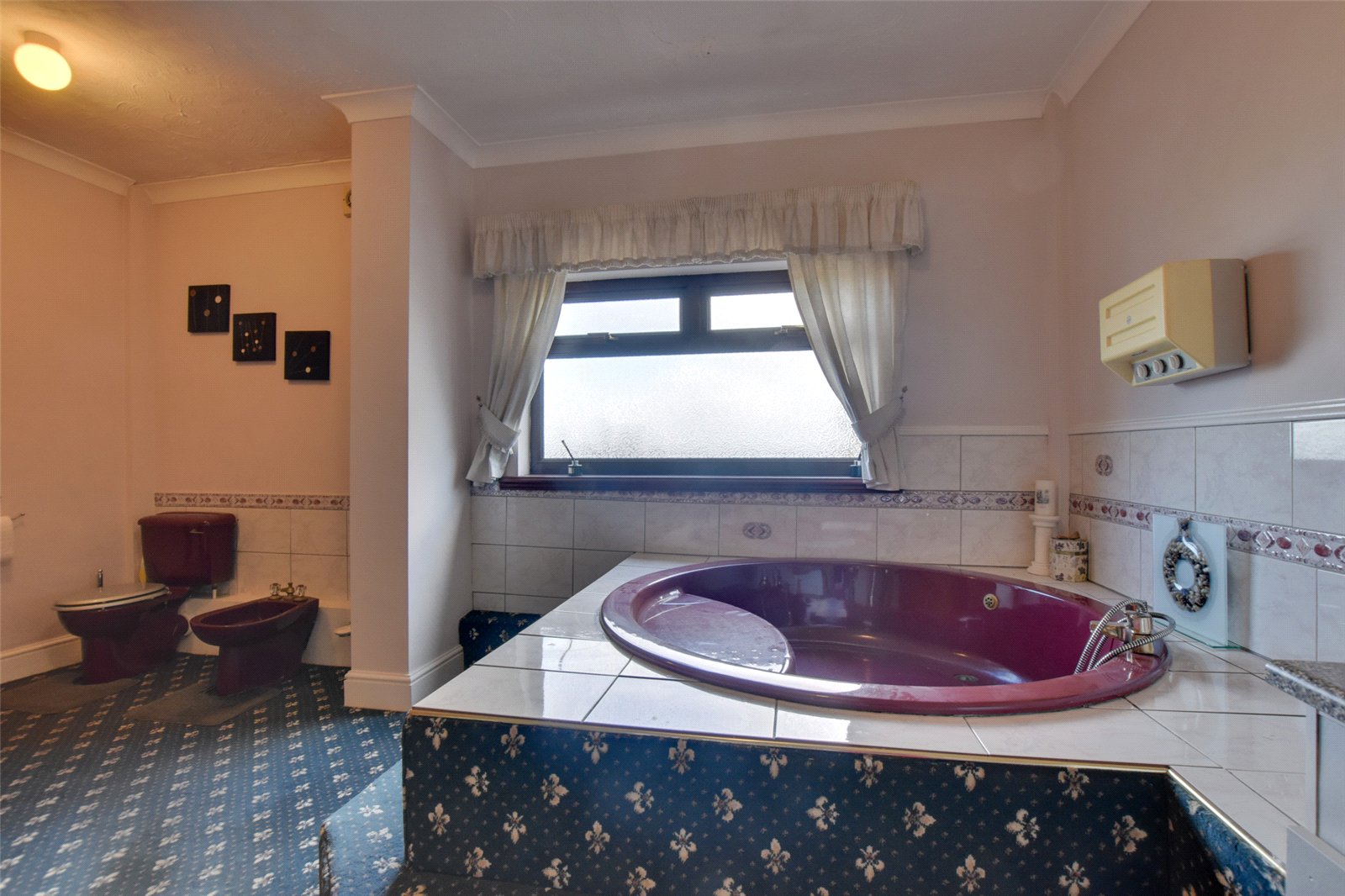 The family bathroom offers space to create a luxurious spa like space. Currently comprising of a coloured suite with WC, bidet, his and hers vanity, enclosed hand wash basins, and circular plunge bath. There is also a sauna plumbed in, making this an ideal space for relaxing.