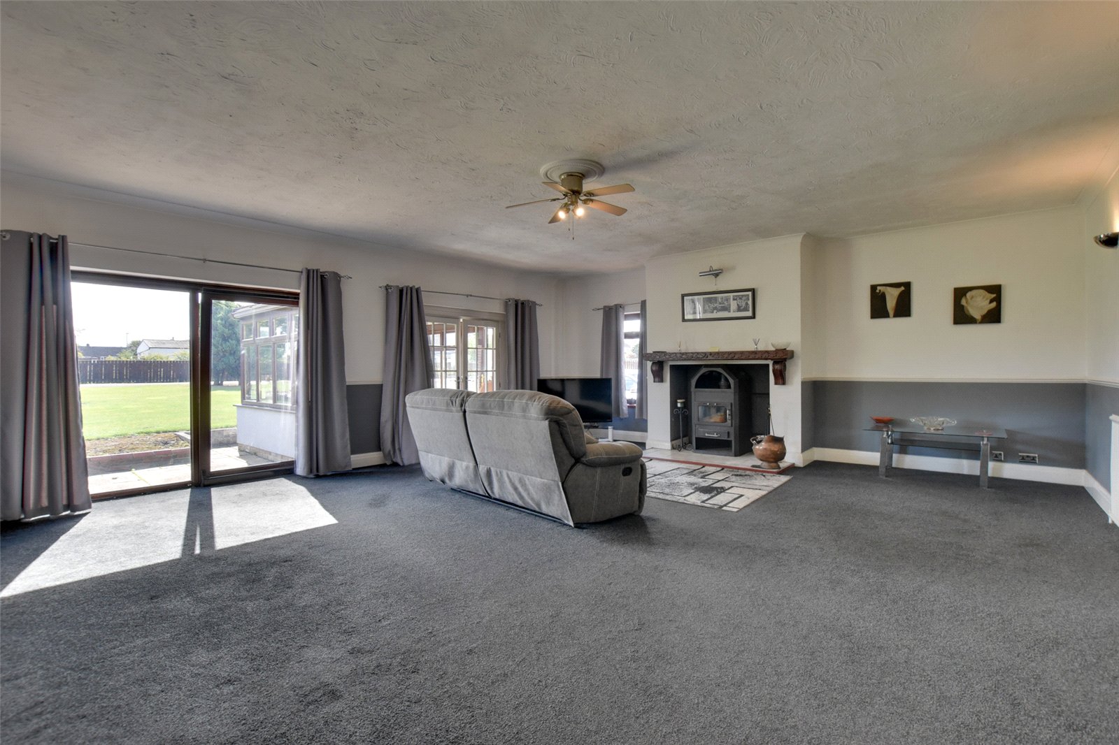 From the conservatory and through patio doors, there is a spacious living room, which could also easily be used as an open plan living and dining room. Boasting patio doors which also lead to the garden, the focal point of the room is the large multi-fuel stove, which is recessed into the chimney breast with a tiled hearth and wooden mantel over.