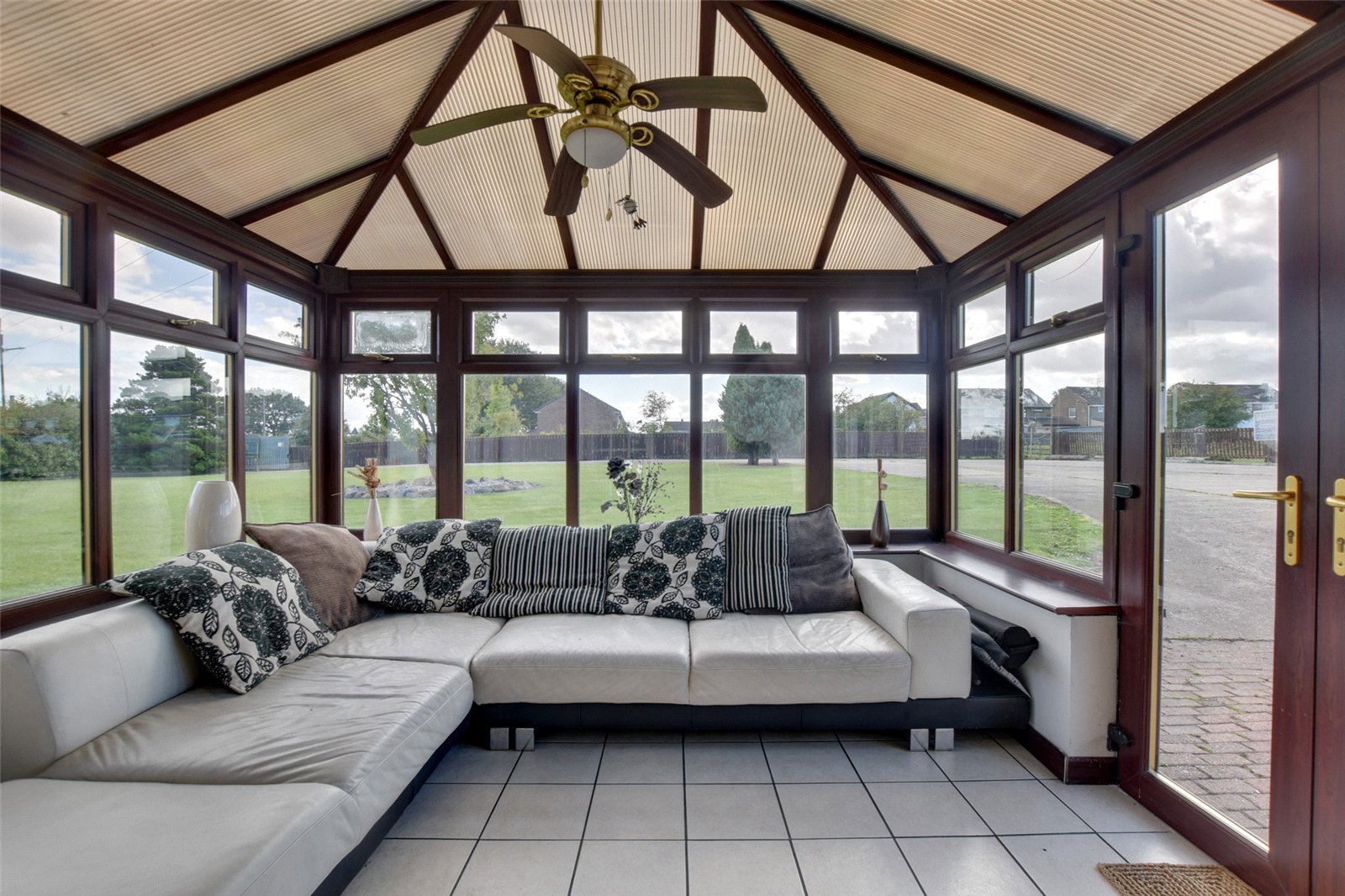 The main entrance leads into the UPVC conservatory through French doors. The floor is tiled, and this pleasant room enjoys views across the garden.