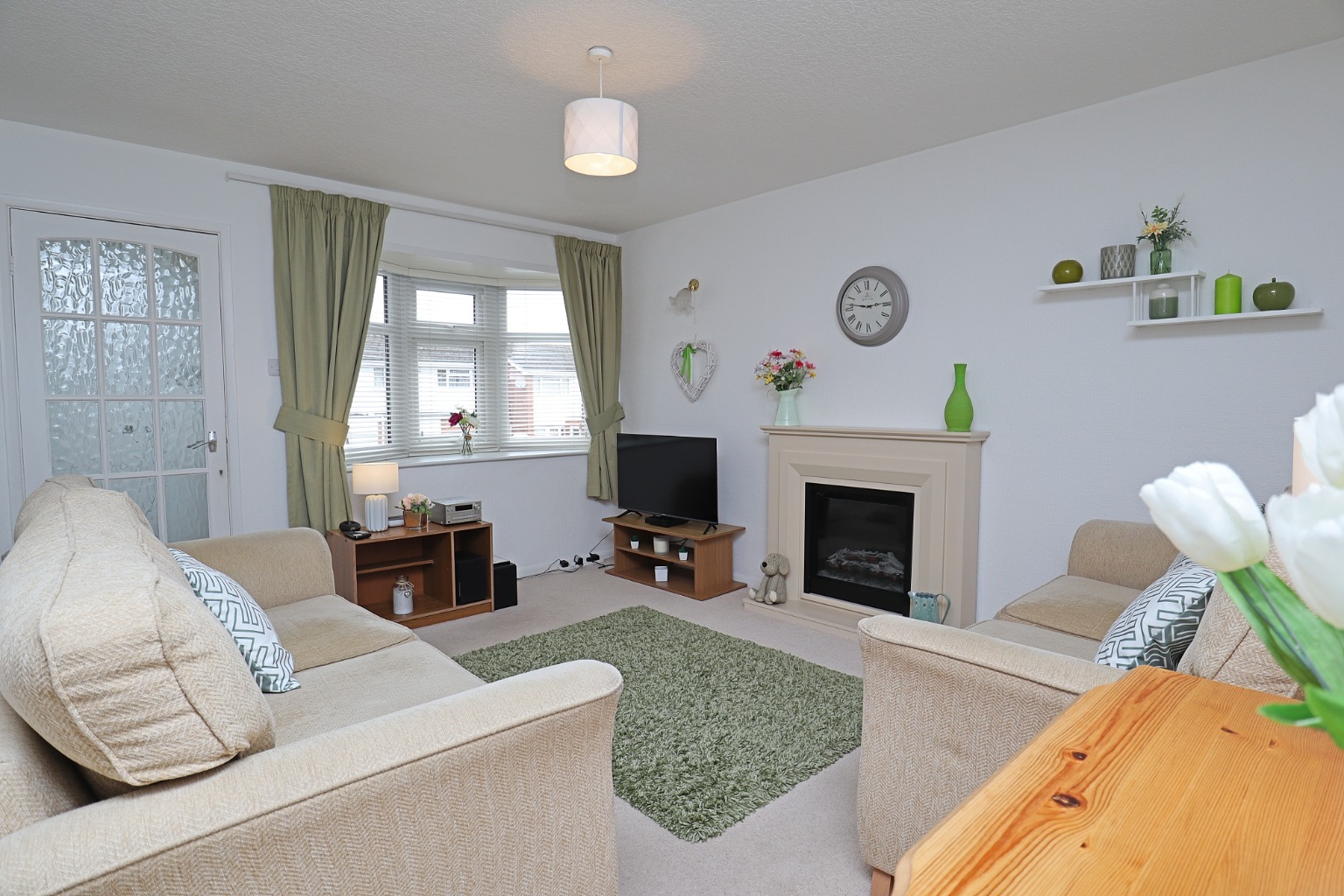 Lounge11' 5" x 13' 11" (3.48m x 4.24m)Having an electric feature fire, central heating radiator and upvc sealed unit double glazed bow window.